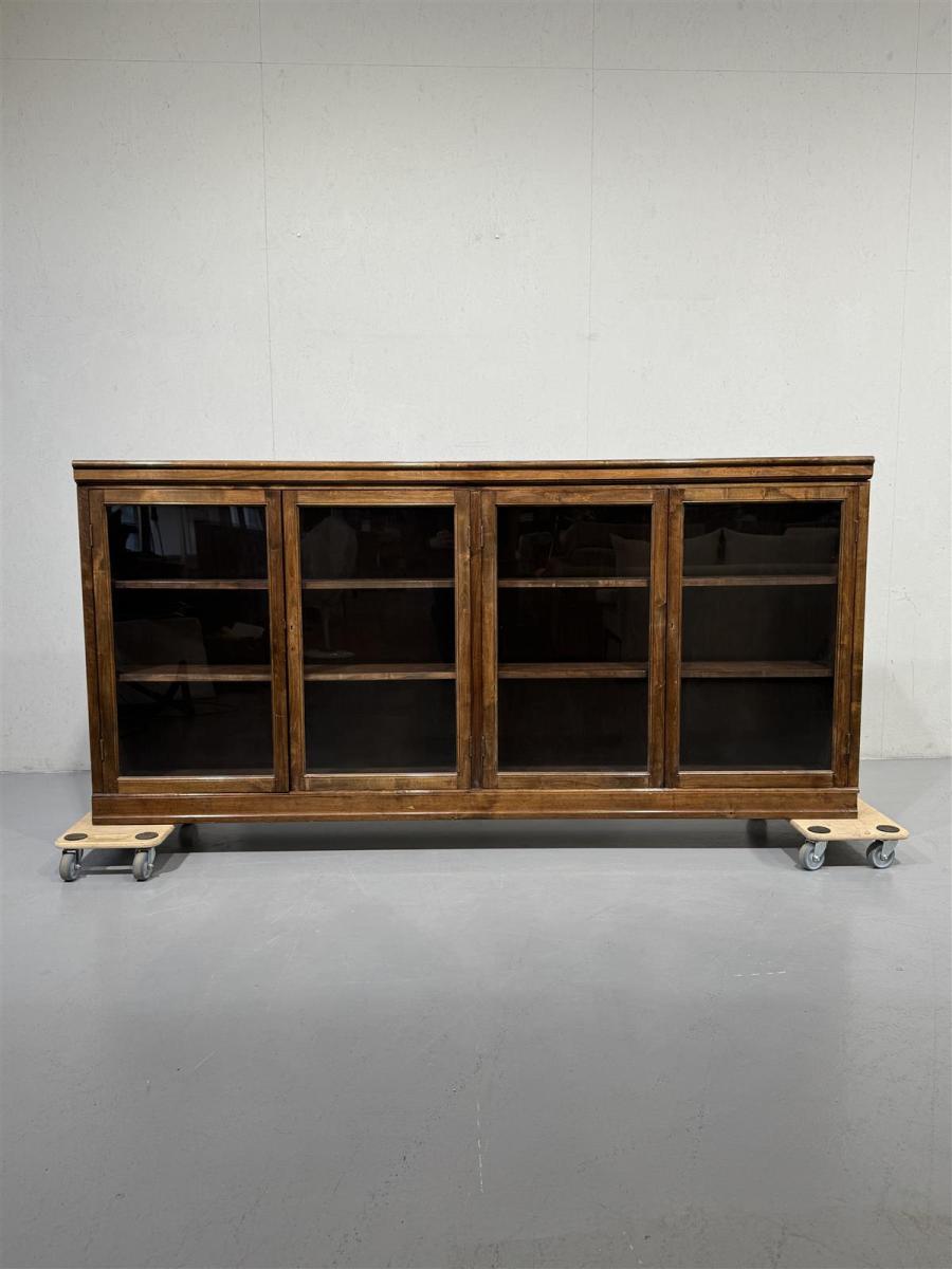 Vintage vitriinikaappi, isokokoinen, jossa on neljä lasiovea ja useita siirreltäviä hyllyjä. Kaapin mitat ovat noin 223 cm leveys ja 110 cm korkeus. Raskas.