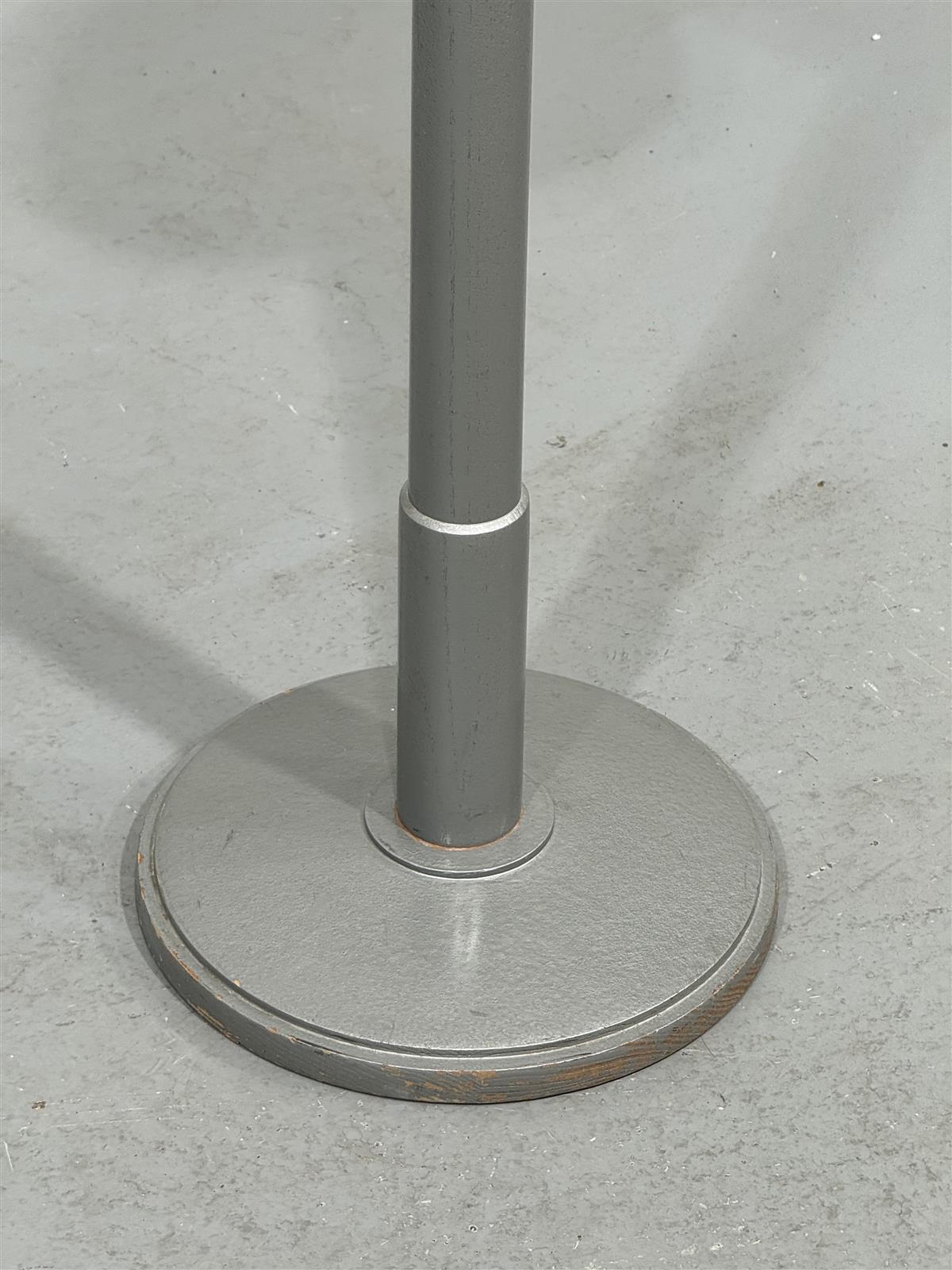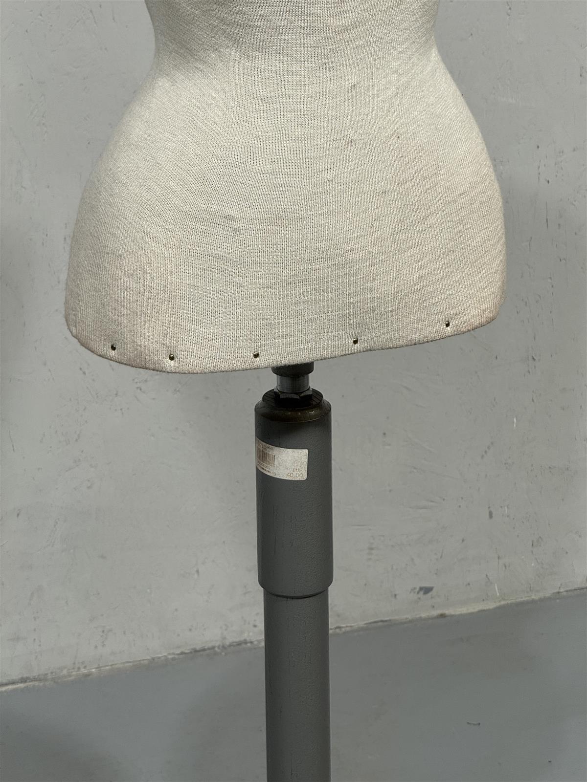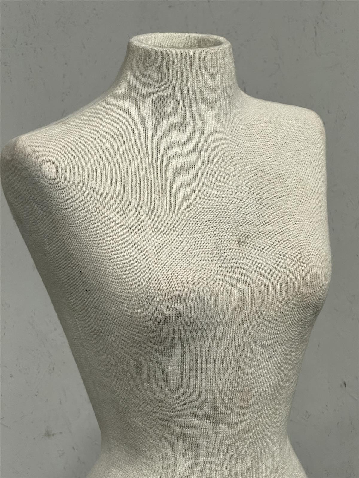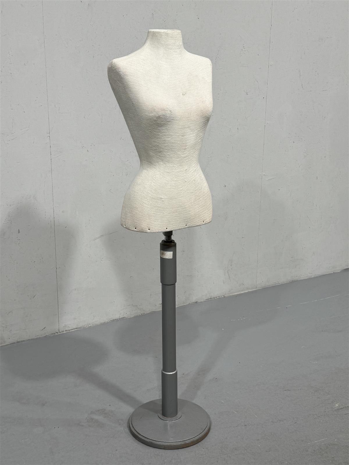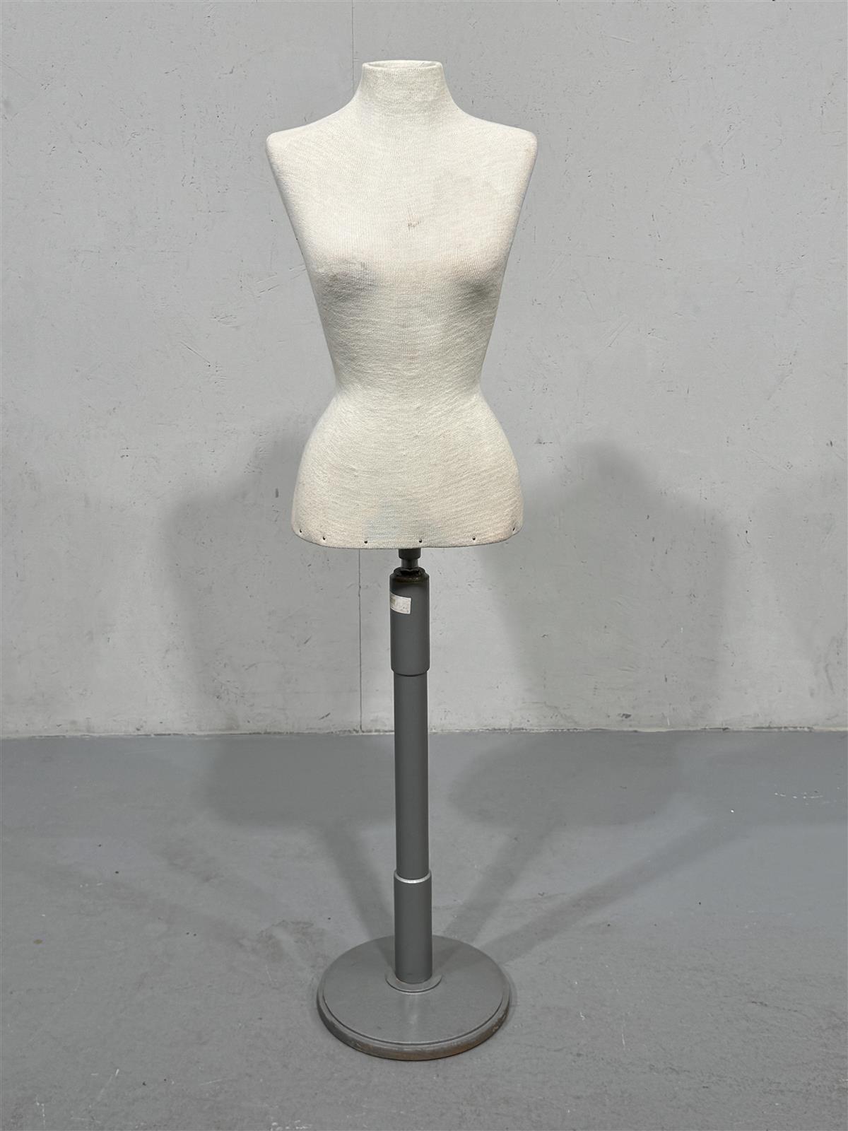 Säädettävä mallinukke, jossa on valkoinen torso ja harmaa jalusta. Jalusta on pyöreä ja tukeva, ja torso on muotoiltu naiselliseksi.