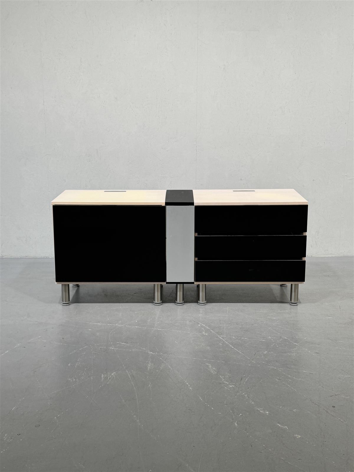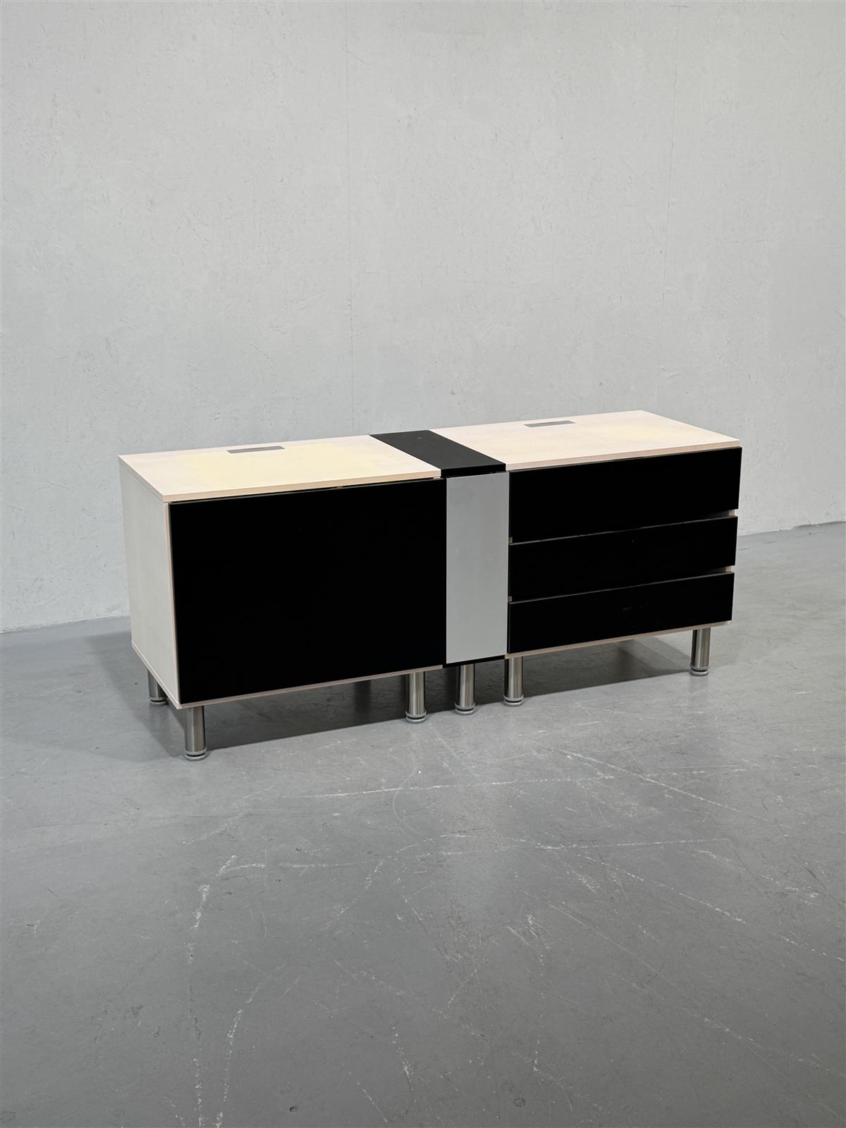 Moderni säilytyskaluste, jossa on mustat vetolaatikon paneelit ja valkoiset paneelit sekä metalliset säädettävät jalat. Kalusteessa on useita syviä vetolaatikoita ja keskellä metallinen lokero, joka avautuu yläosasta, jotka tarjoavat runsaasti säilytystilaa. Yksinkertainen ja tyylikäs muotoilu sopii monenlaisiin sisustuksiin. Lipasto 2 osassa ja vaatii ruuvauksen yhteen. Erittäin raskas kokoisekseen.