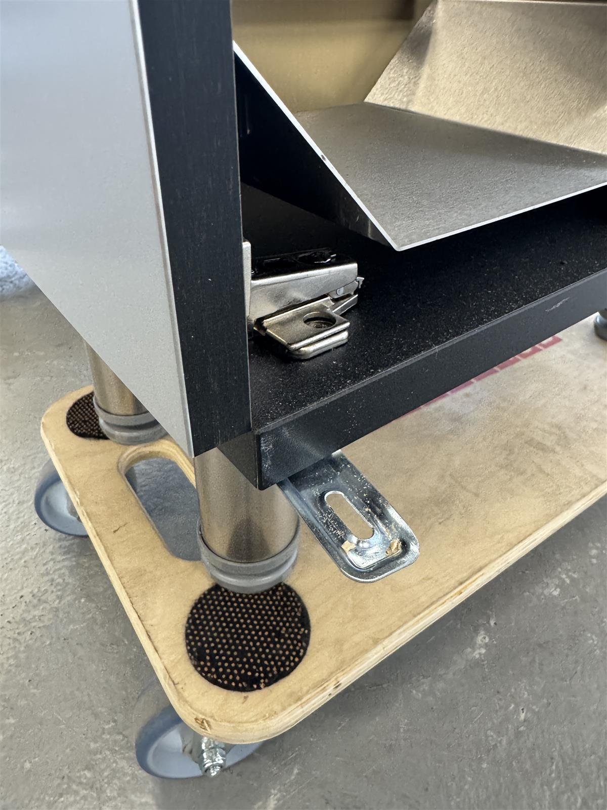 Kaluste on hyvässä kunnossa, mutta siinä on käytön jälkiä ja tasossa värivaihtelua. Metallijalat ovat tukevat ja laatikot liukuvat sujuvasti. Kahdessa osassa, vaatii yhteen ruuvauksen.