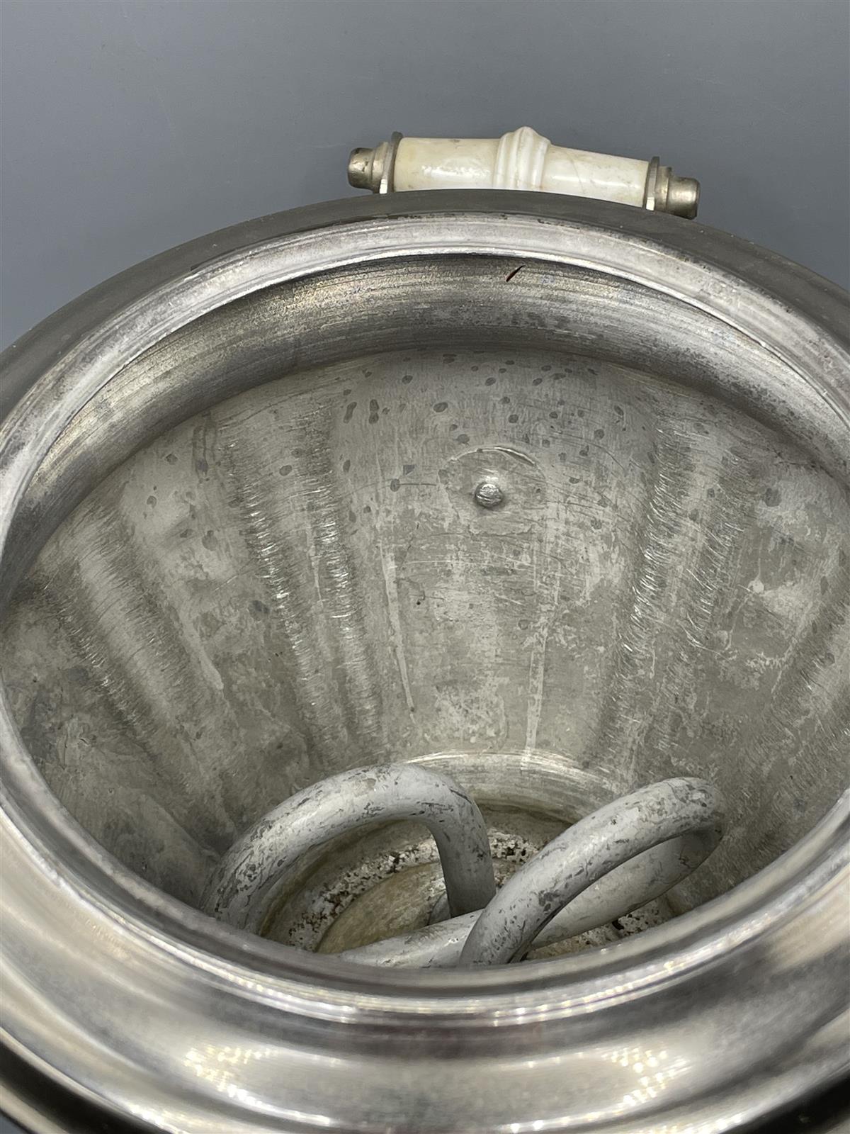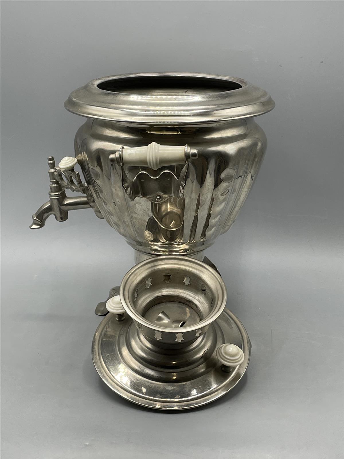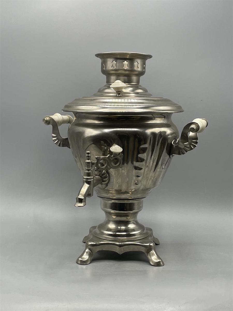 Metallinen samovaari, jossa on koristeelliset kahvat ja jalat. Kansi on irrotettava ja siinä on koristeellisia aukkoja. Sisäpuolella on lämmityselementti, joka on hieman kulunut/hapettunut käytön jäljiltä.