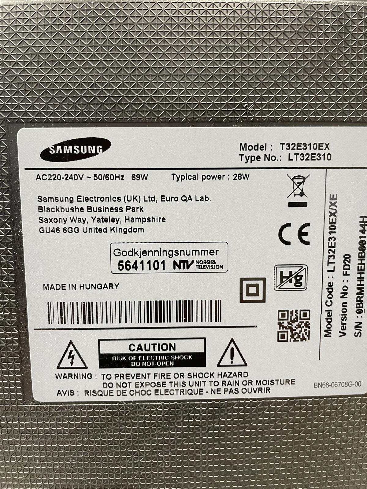Samsung 32-tuumaa Full HD T32E310EX televisio. 2 x HDMI, Scart, komponentti ja USB liitännät. Kaukosäädin.