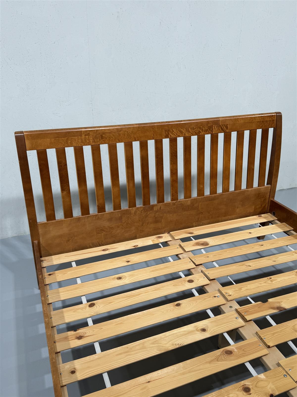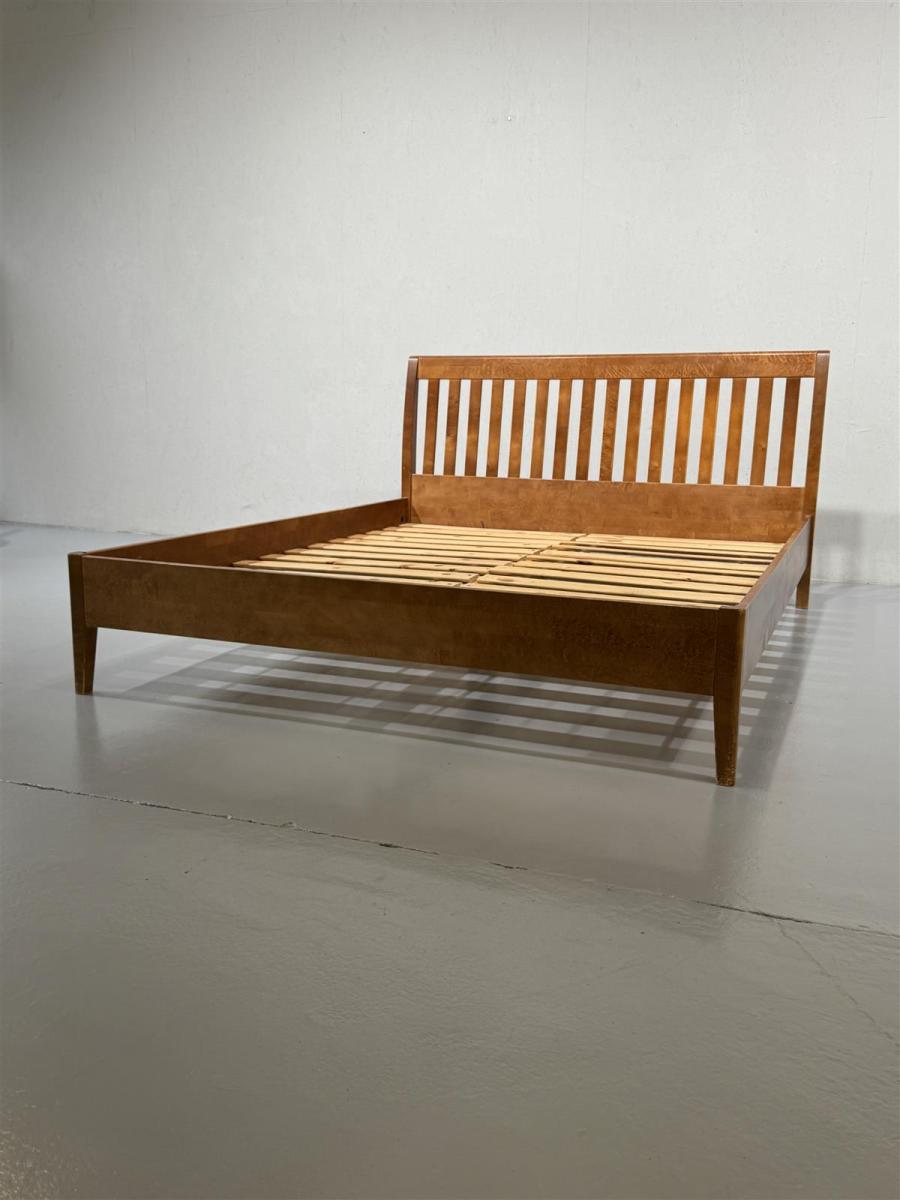 Siisti parisängyn puurunko sälepohjalla. Sängyn runko on valmistettu kestävästä puusta, joka antaa sille tukevan rakenteen ja luonnollisen ilmeen. Pääty on muotoiltu kaartuvilla, pystysuorilla säleillä, jotka lisäävät sängyn visuaalista kiinnostavuutta ja antavat sille ilmavan tunteen. Ulkomitta 168cm x 211cm, mukana ei ole patjoja. Sänky kokonaisena, ostaja vastaa purkutyöstä, mikäli haluaa osiin.