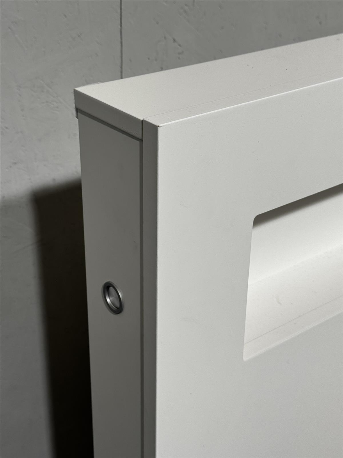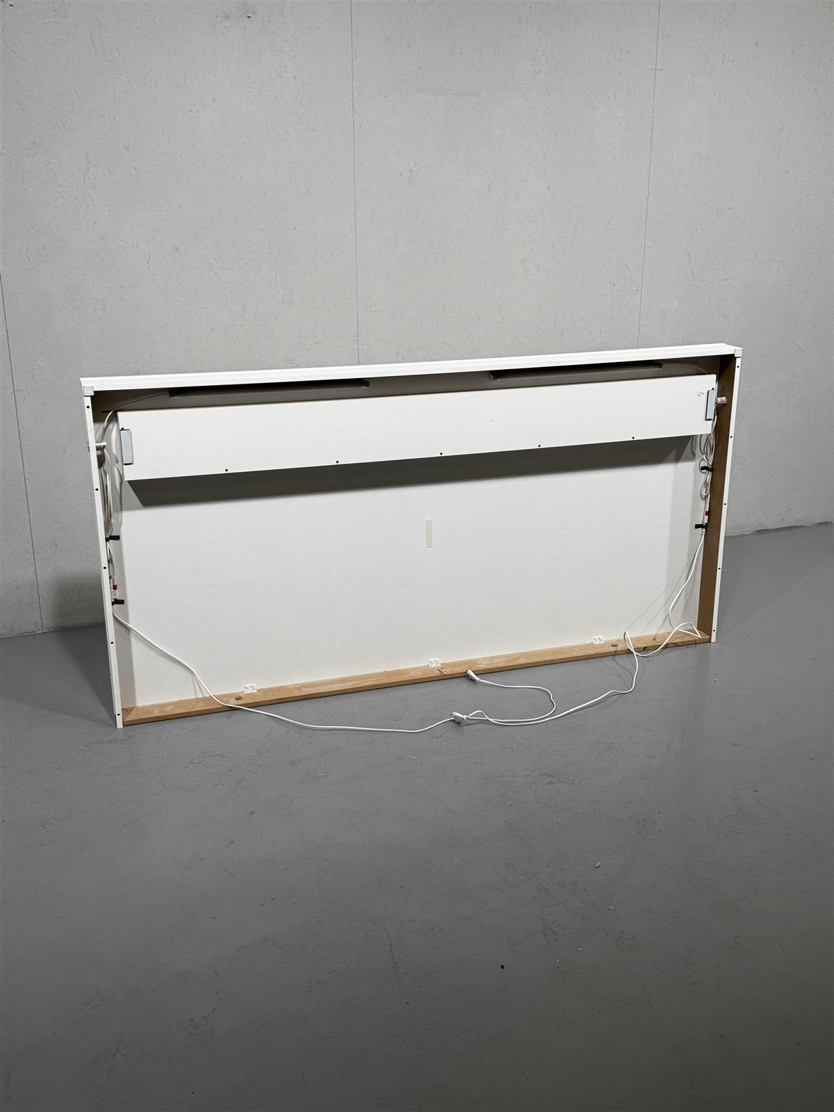 Valkoinen sängyn pääty, jossa on taso ja valaisimet yläosassa. Kotelon reunoilla valaisinten katkaisimet (toisen puolen lamppu palanut ja vaatii vaihdon, huomioitu hinnassa).
