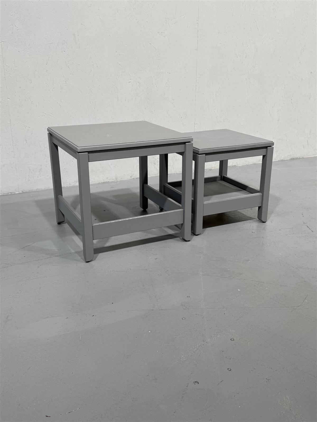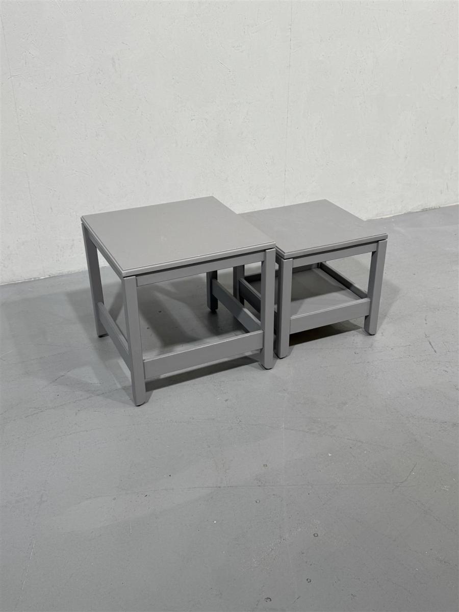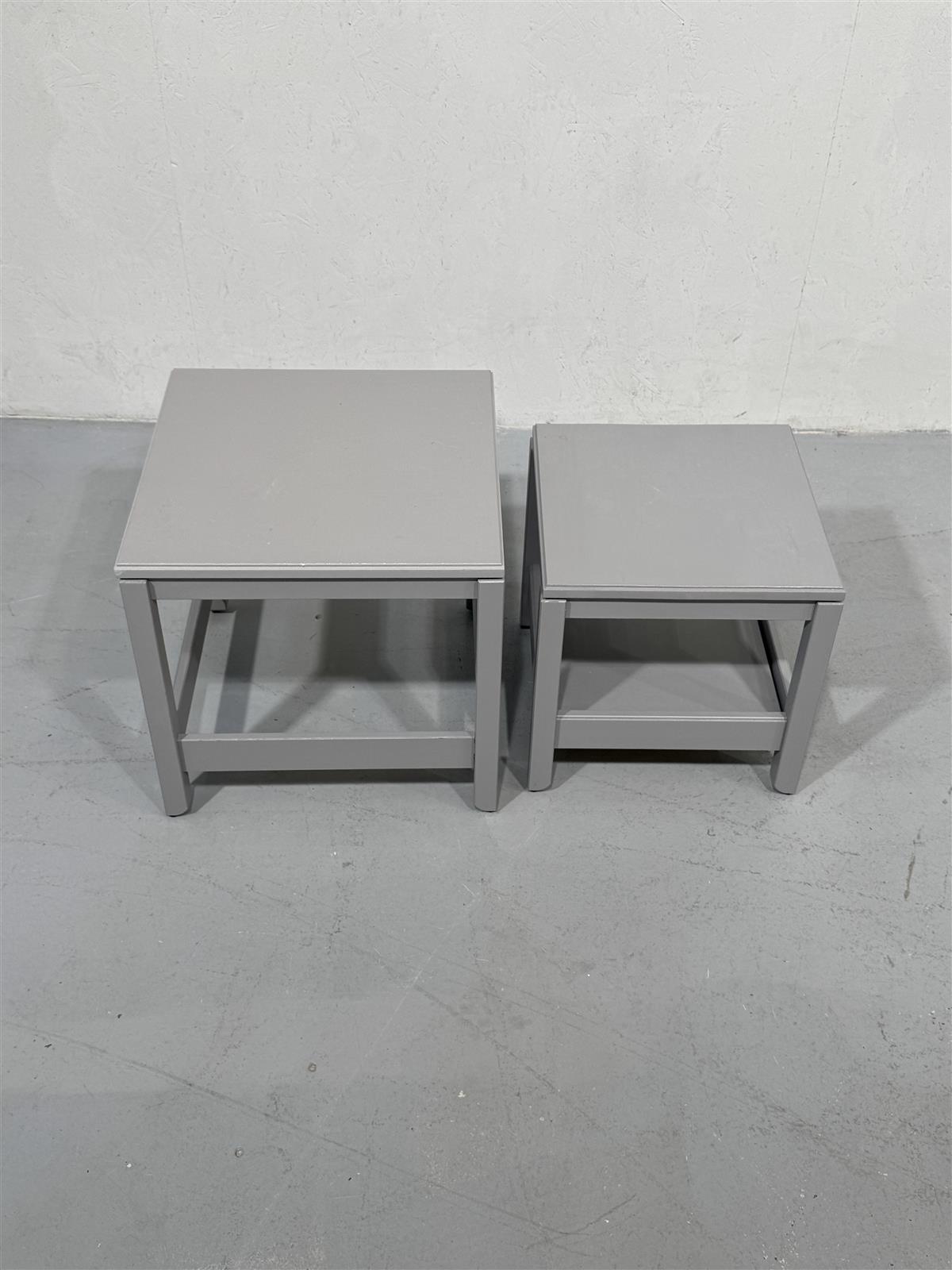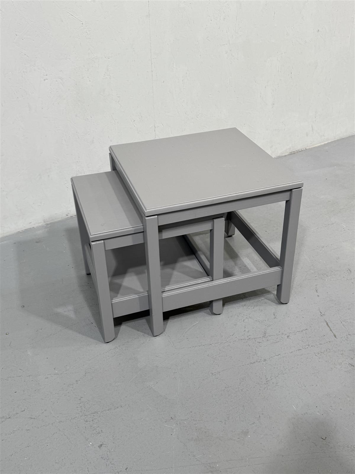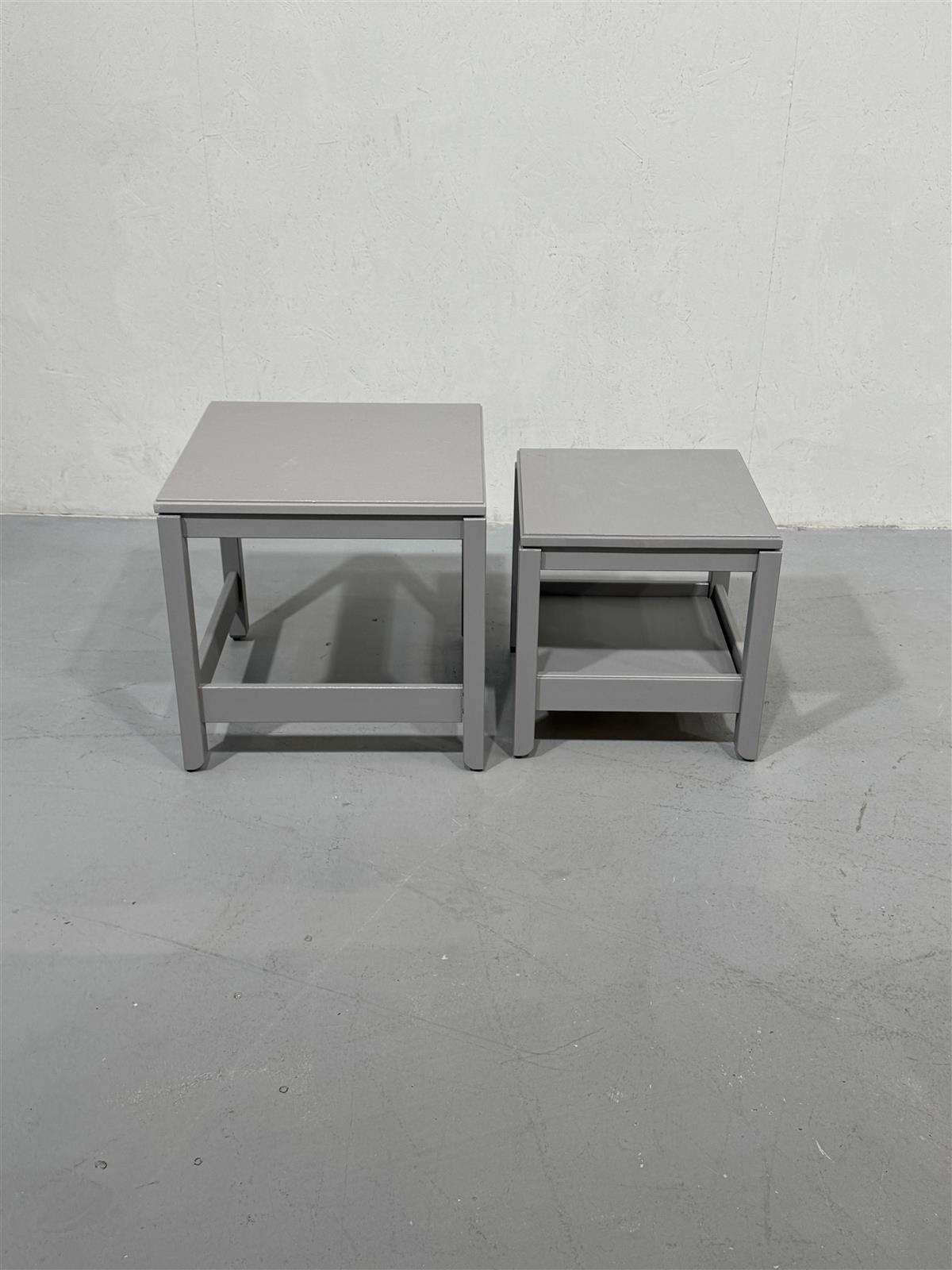 Käytännöllinen sarjapöytä, joka koostuu kahdesta erikokoisesta pöydästä. Pöydät ovat harmaita ja valmistettu puusta, mikä tekee niistä tukevia ja kestäviä. Ne sopivat hyvin monenlaisiin sisustuksiin ja tarjoavat joustavuutta tilan käyttöön.