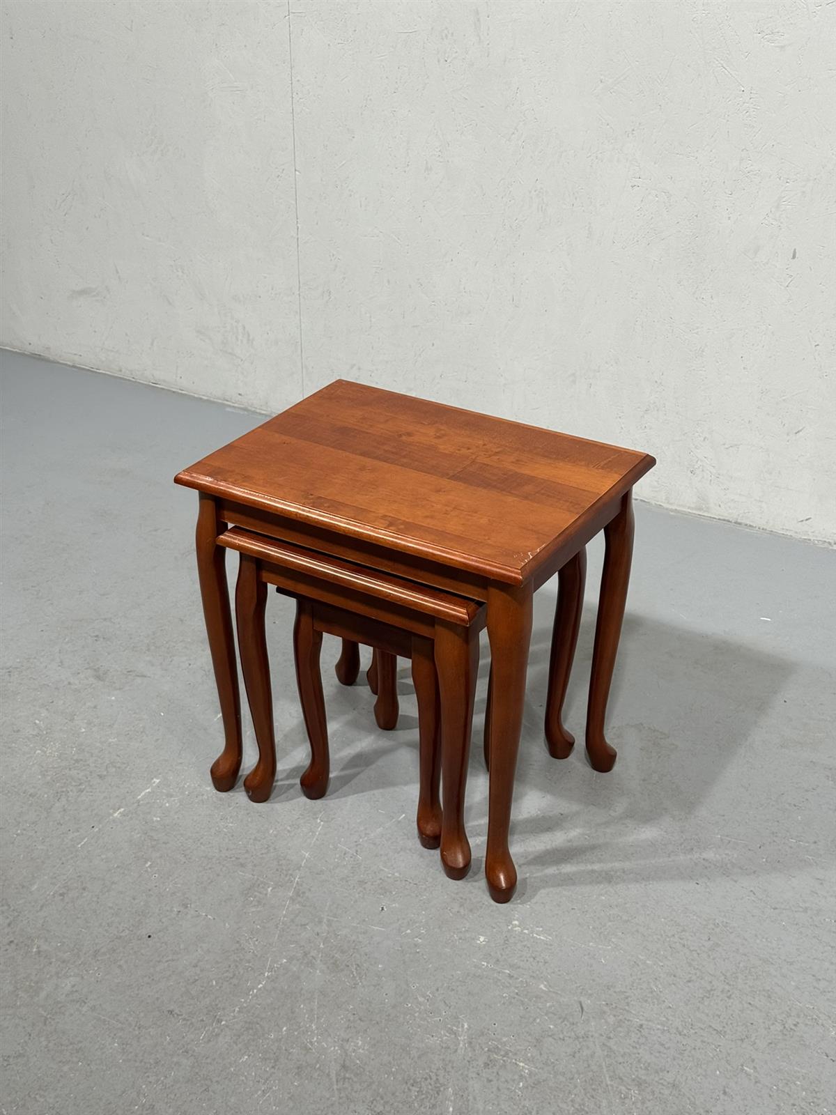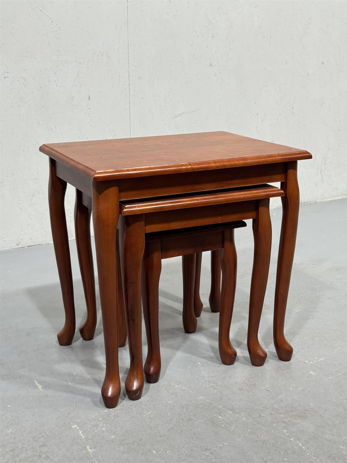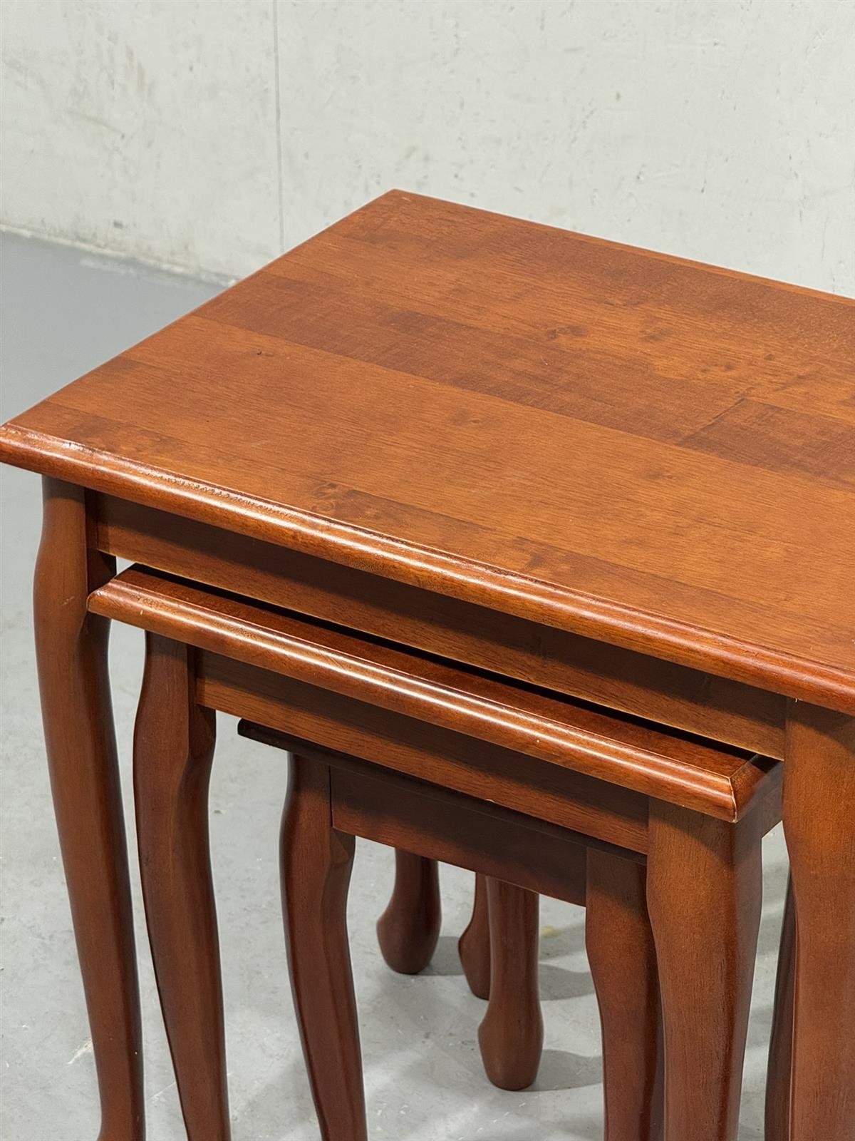 Kolme sisäkkäin menevää pöytää, joissa on kaarevat jalat ja ruskea pinta. Pöydät ovat eri kokoisia ja ne voidaan asettaa sisäkkäin tilan säästämiseksi.
