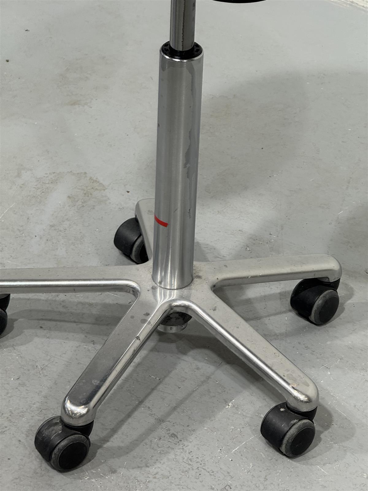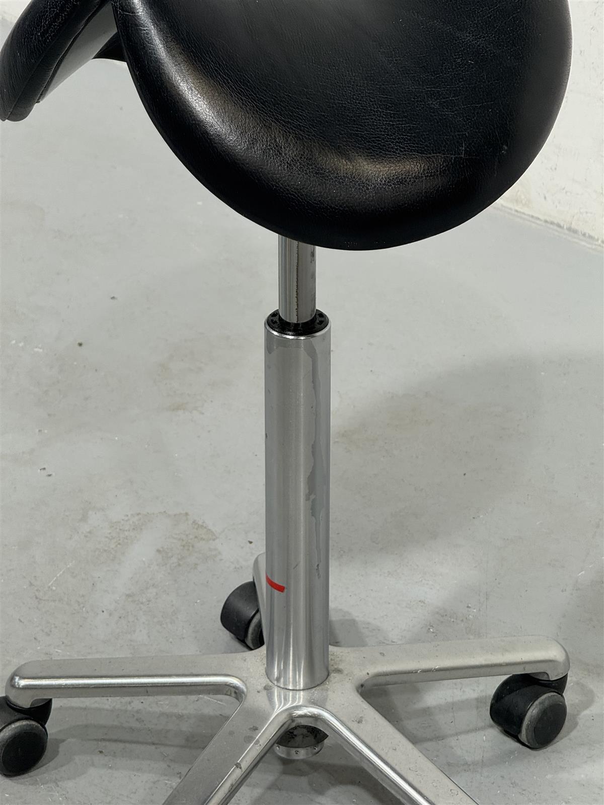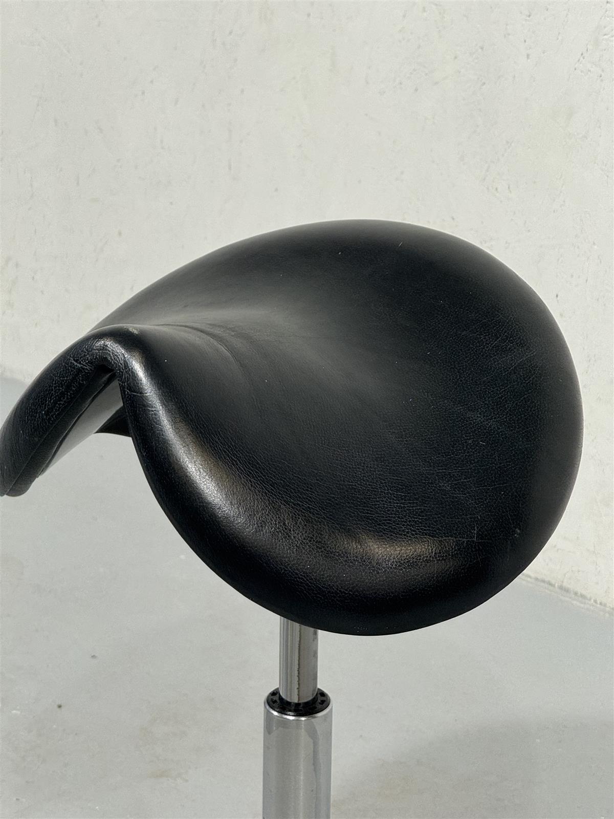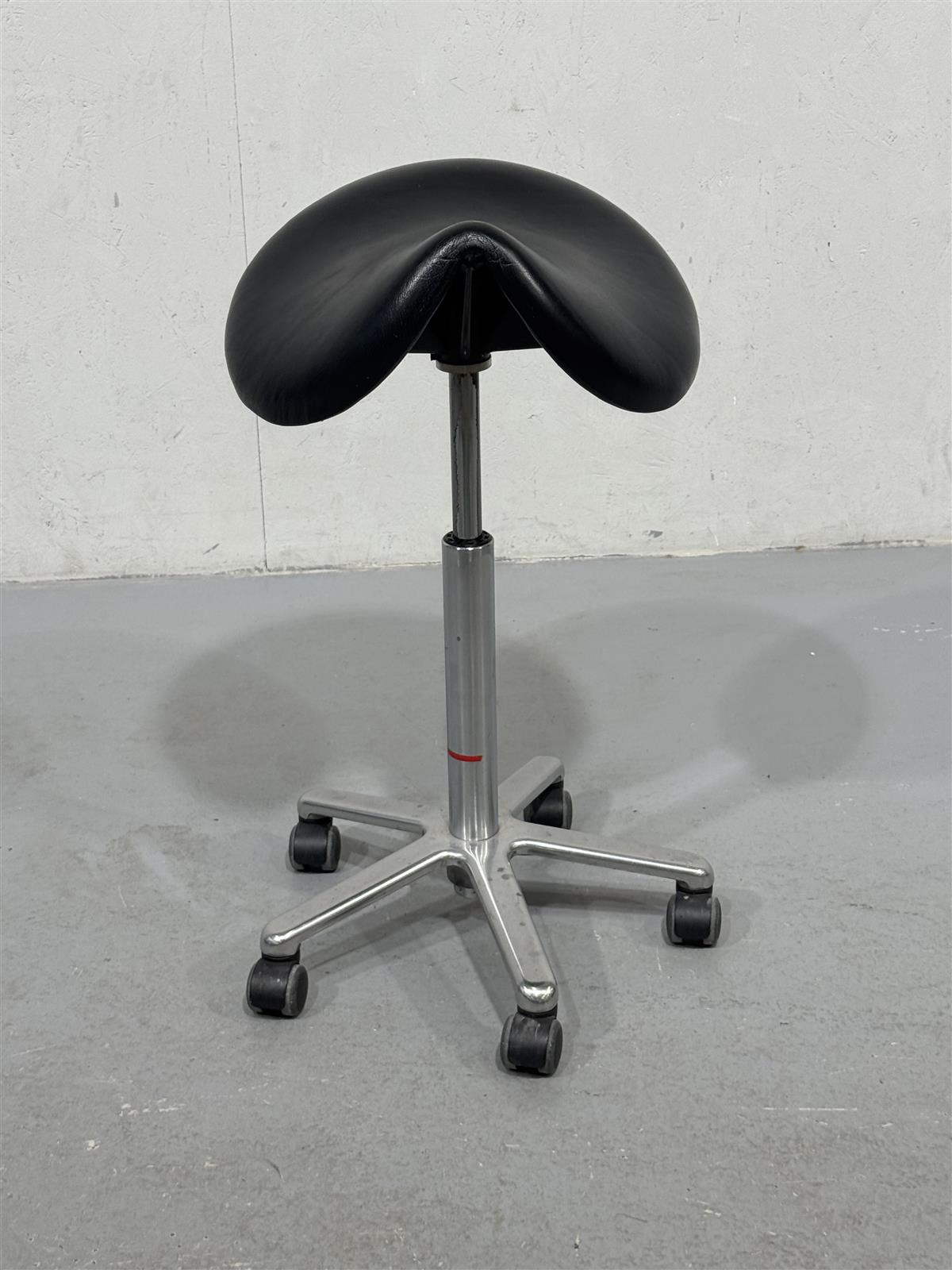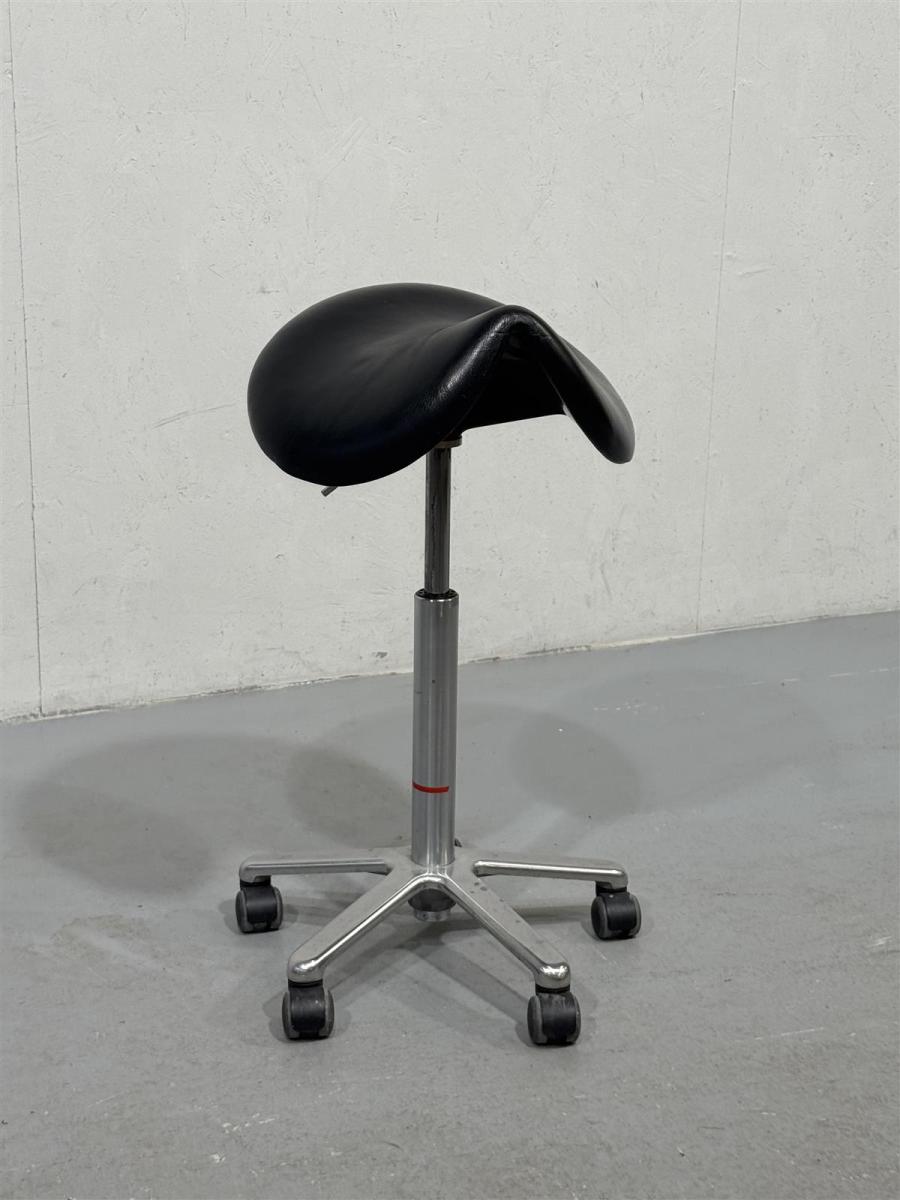 Satulatuoli, jossa on musta istuin ja viisi pyörää. Korkeutta voi säätää kaasujousella.