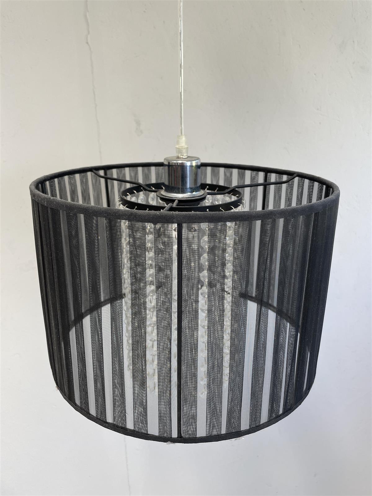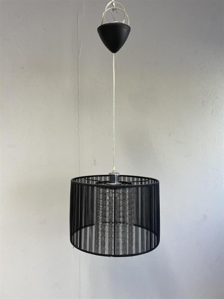 Scan Lamps Vendela kattovalaisin, jossa on musta kangasvarjostin ja roikkuvat lasihelmikoristeet.