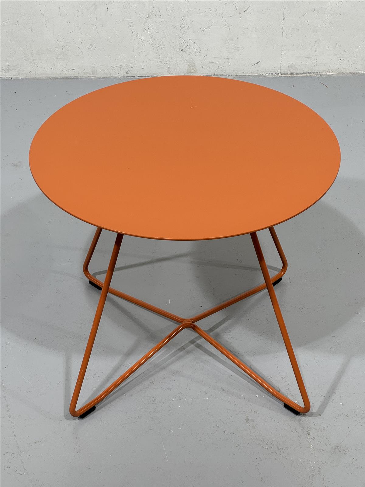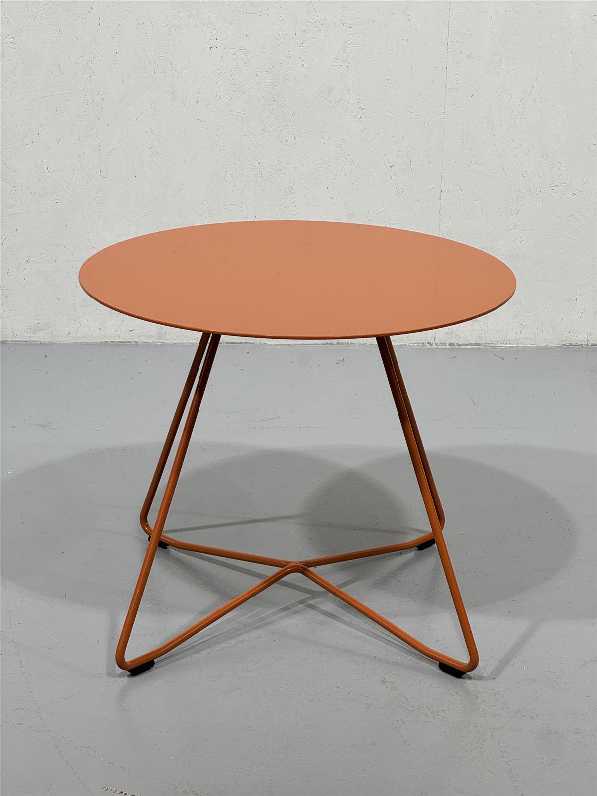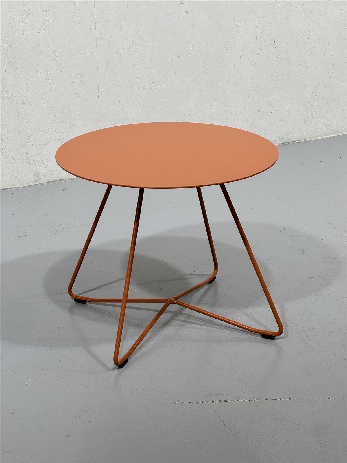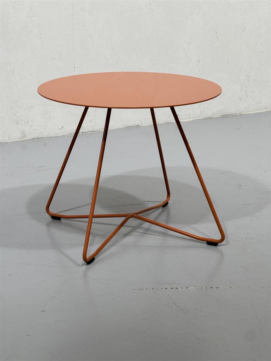 Moderni pyöreä Scoop sohvapöytä, jossa on oranssi metallinen kansi ja sirot metallijalat. Pöydän muotoilu on yksinkertainen ja tyylikäs, sopien hyvin moderniin sisustukseen. Kansi on tasainen ja jalat muodostavat geometrisen kuvion, joka tuo mielenkiintoisen ilmeen pöydälle.
