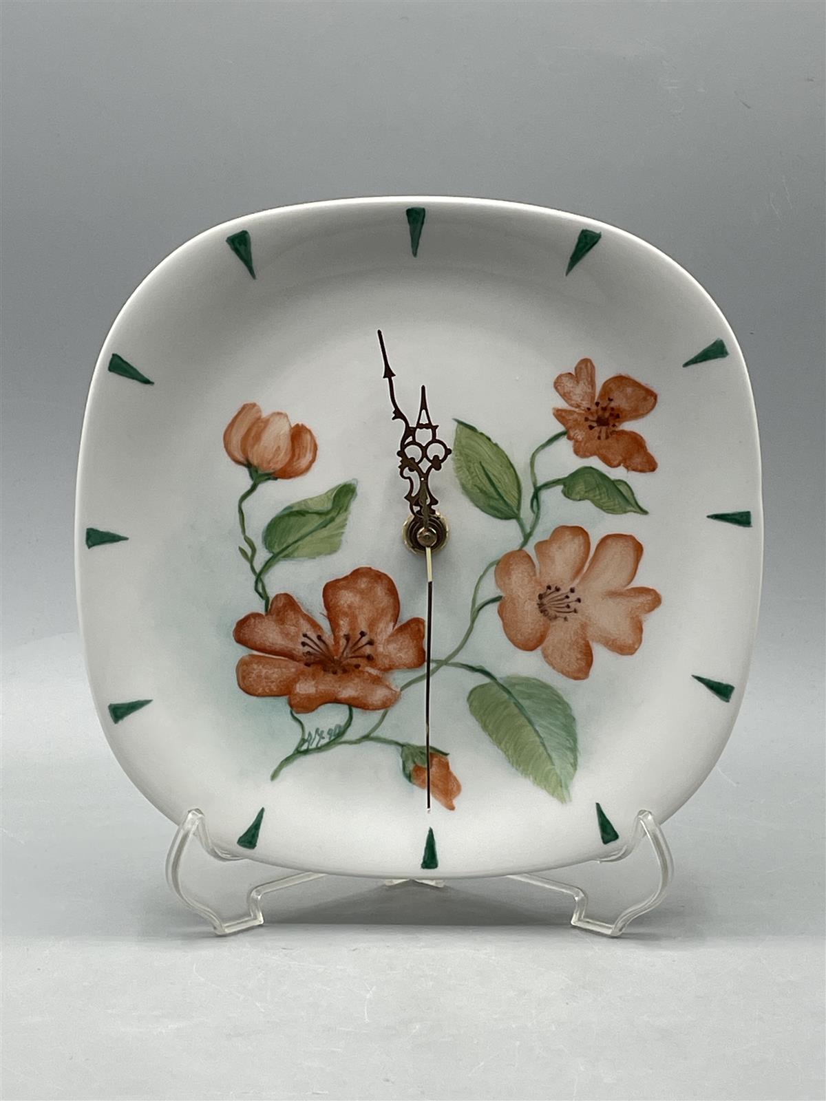 Seinäkello, jossa on käsinmaalatut oranssit kukkakuviot ja vihreät lehdet. Kellotaulussa on vihreät tuntimerkinnät ja koristeelliset viisarit. Kello on valmistettu posliinista ja siinä on kvartsikoneisto takana. 1xAA paristo (ei mukana).