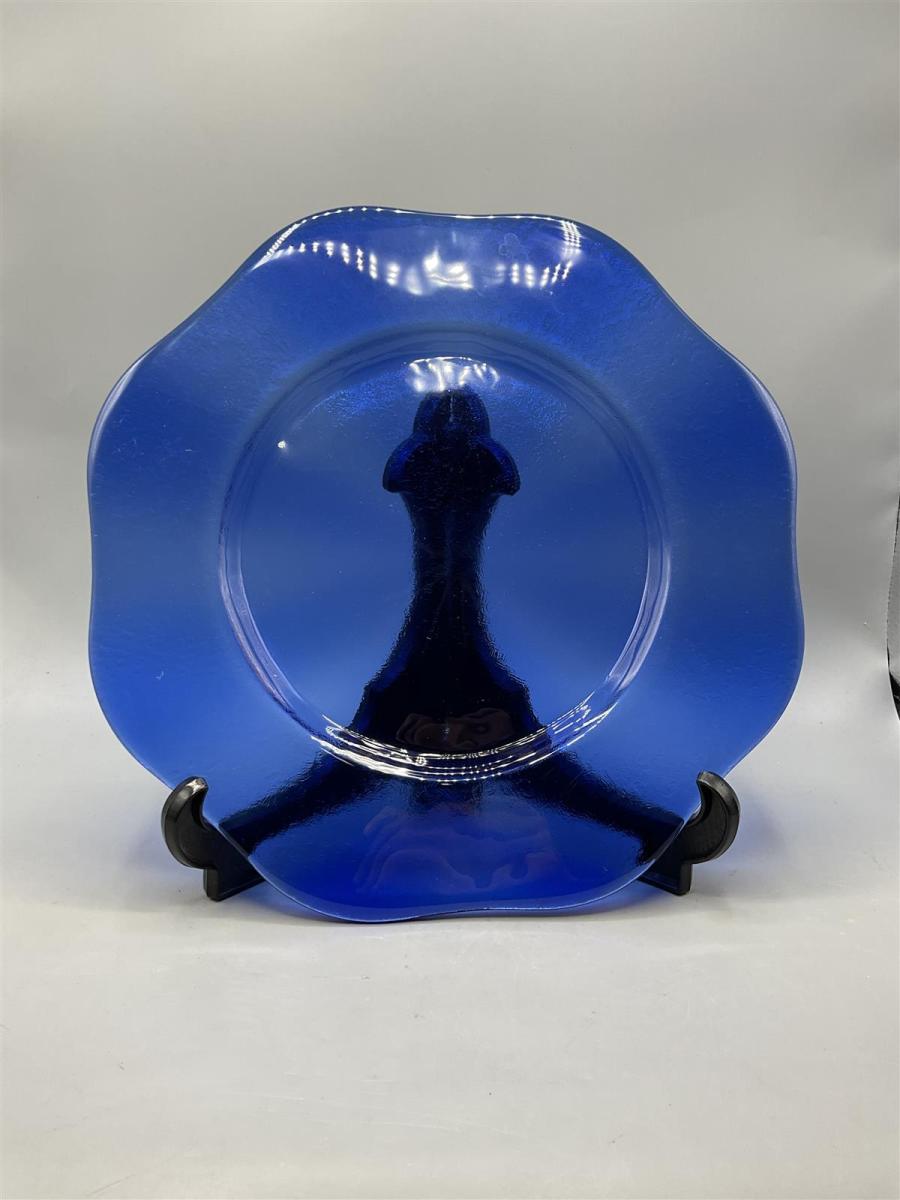 Sininen tarjoilulautanen, jossa on aaltoileva reuna. Lasi on kirkasta ja syvän sinistä. Halkaisija 34cm.