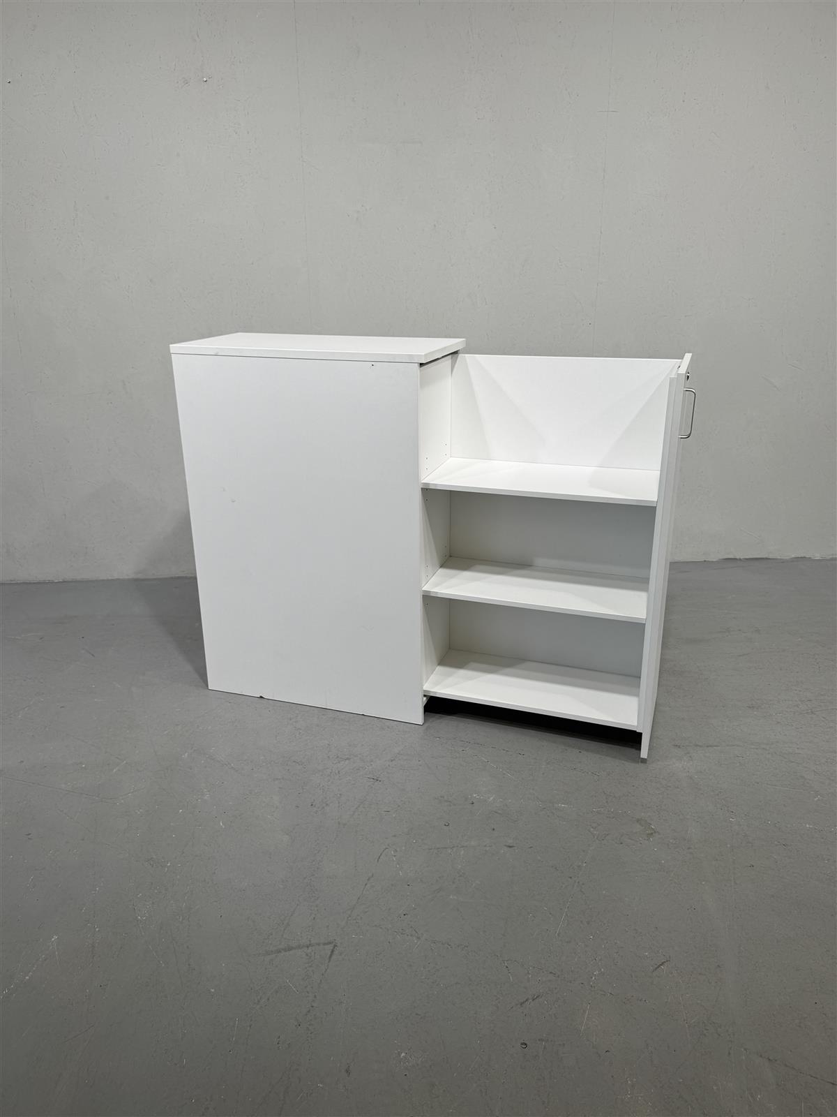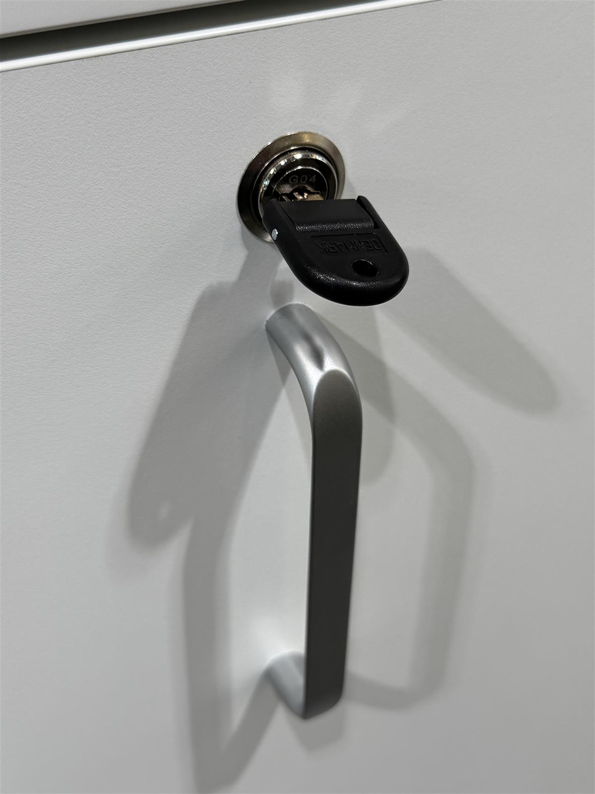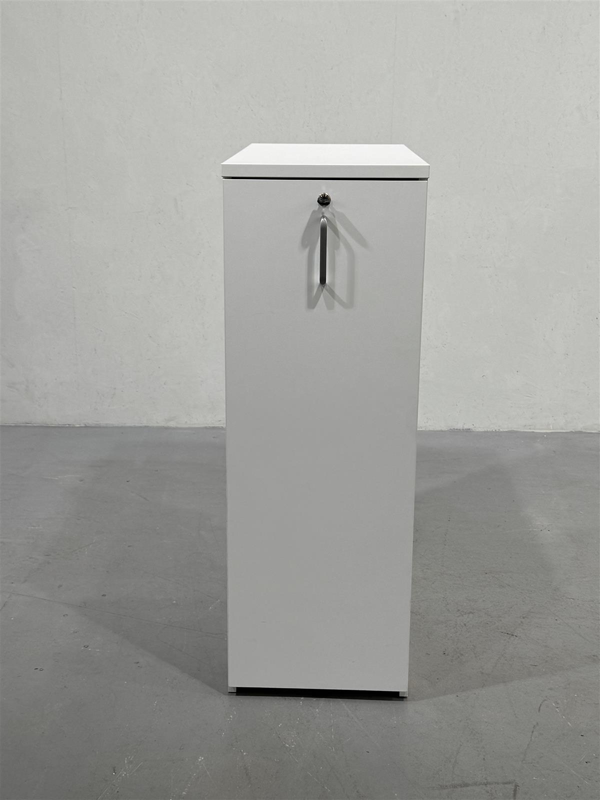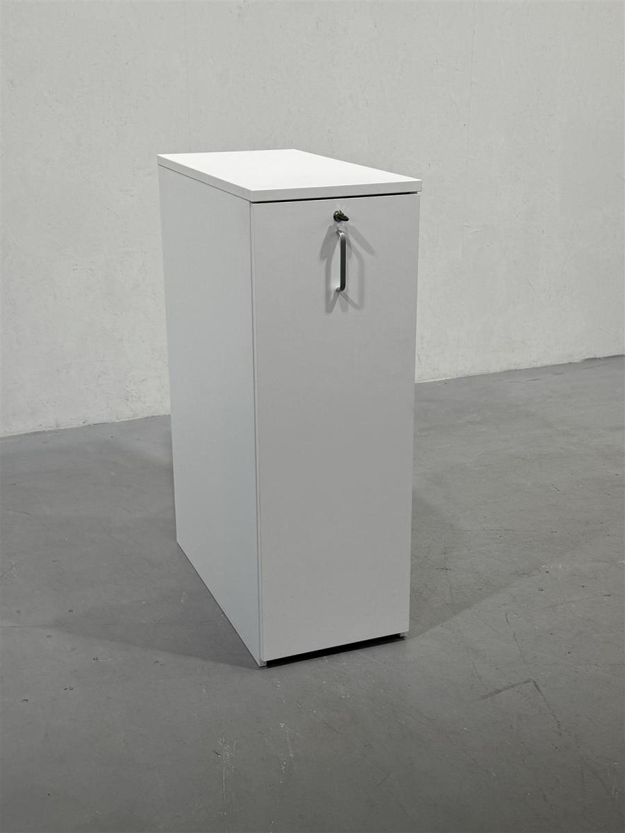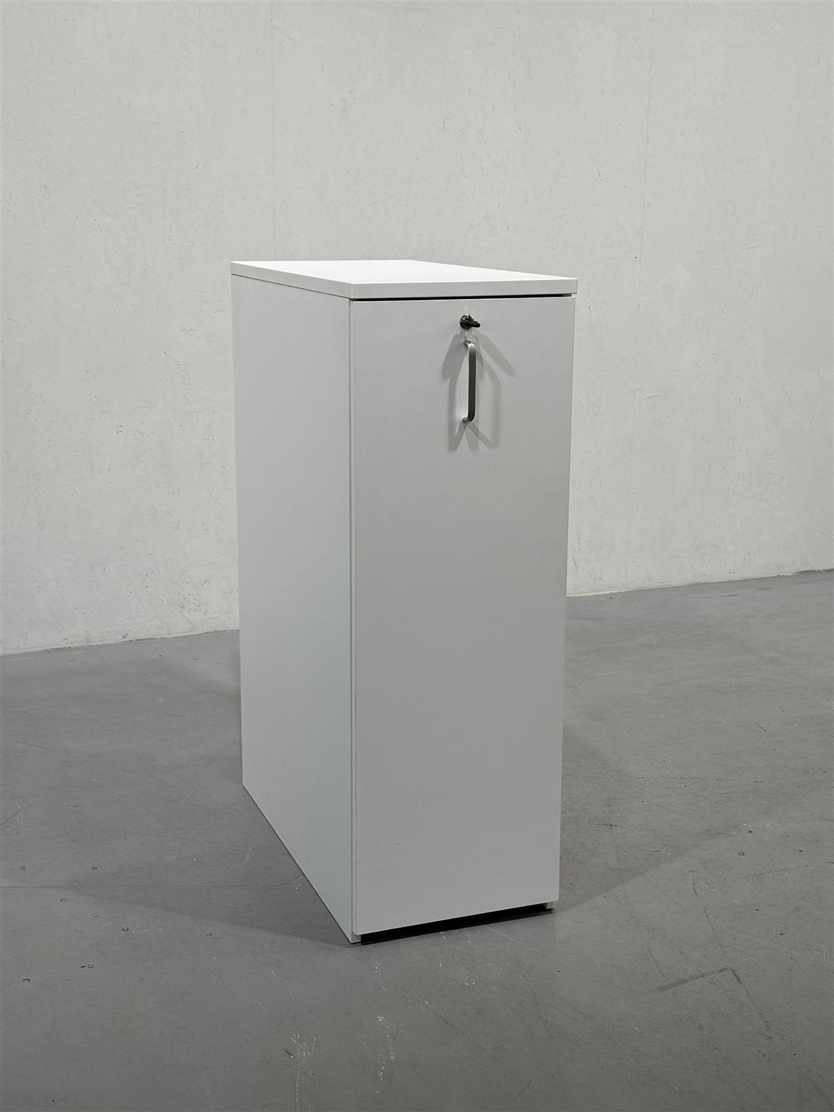 Toimistoon tai työpisteelle sopiva sivukaappi oikealle (tai apteekkarin kaappi). Lukittava, ulosvedettävä hyllykkö, jossa kolme tasoa. Perussiistissä kunnossa, hieman alkuun pyyhittävää.