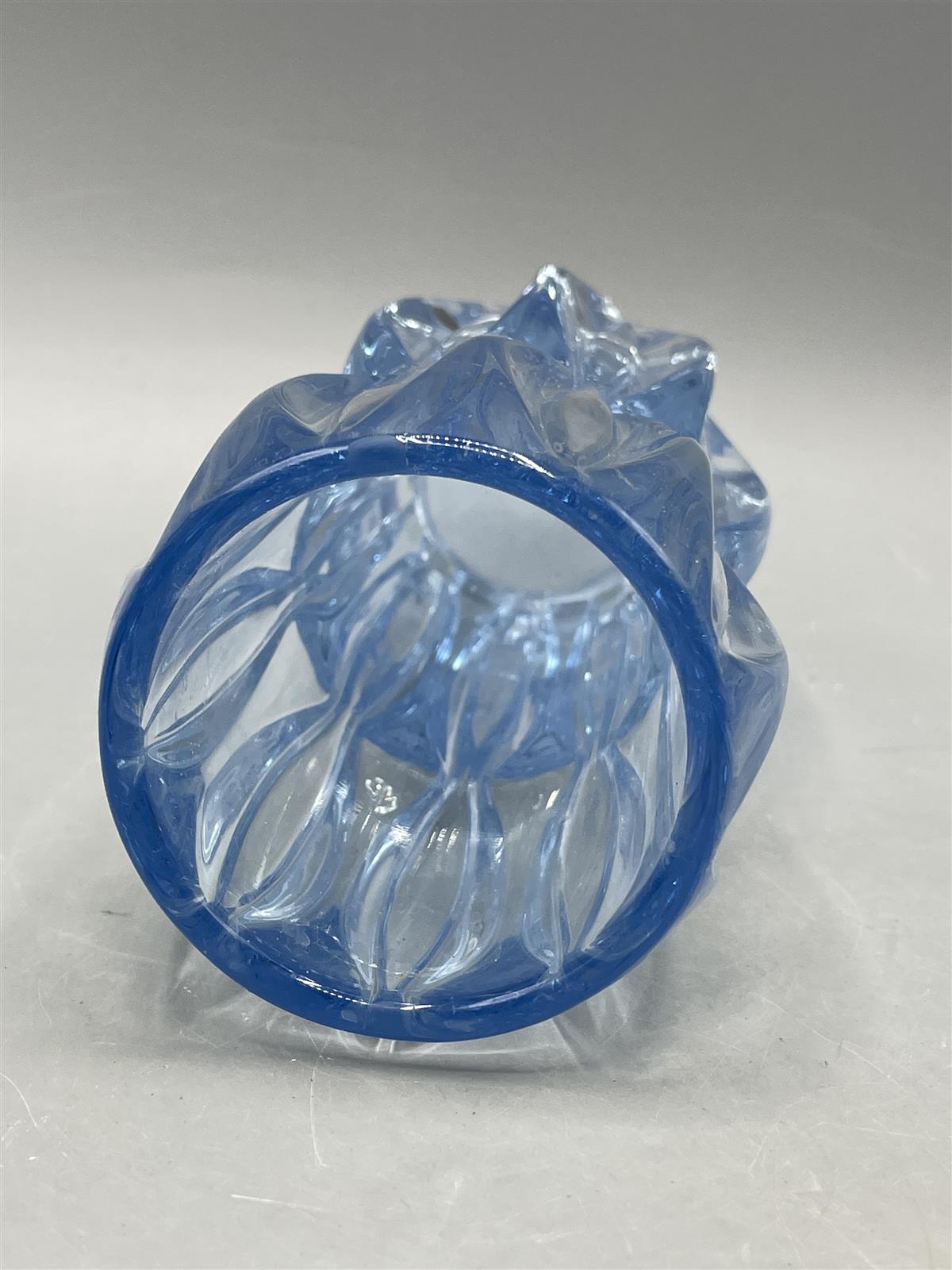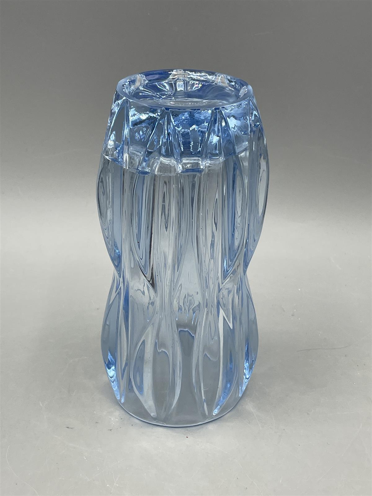 Sklo Union maljakko, jossa on kauniisti muotoiltu sininen lasi. Design Jan Schmid Rosice, Tsekkoslovakia.