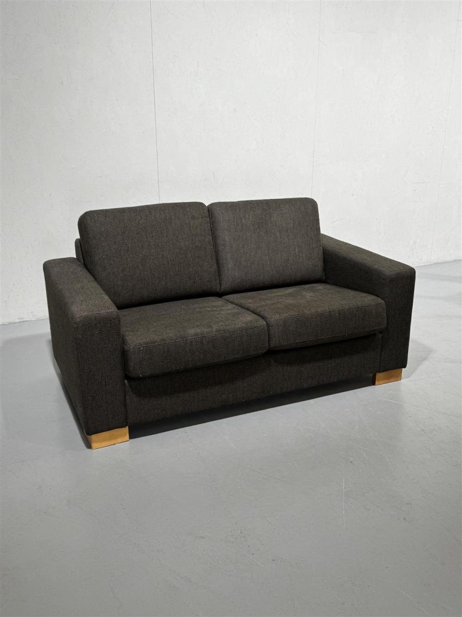 Tukeva kaksipaikkainen sohva, jossa on ruskea kangasverhoilu ja puujalat. Sohva on kompakti ja sopii hyvin pienempiin tiloihin. Istuinkorkeus 47cm, irralliset tyynyt, verhoilut pystyy pesemään.