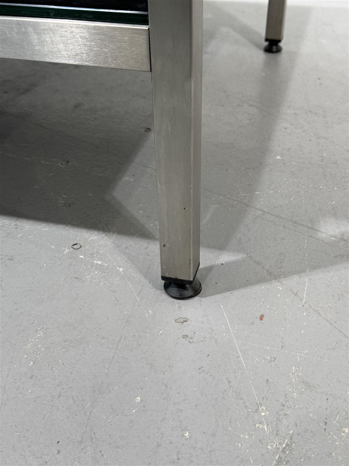 Pöydän lasipinnassa on havaittavissa käytön jälkeä ja hieman pyyhittävää. Alatason keskellä lasin alareunassa vekki (ks kuva). Metallirungossa on pieniä kulumajälkiä, mutta yleisilme on siisti ja käyttökelpoinen.