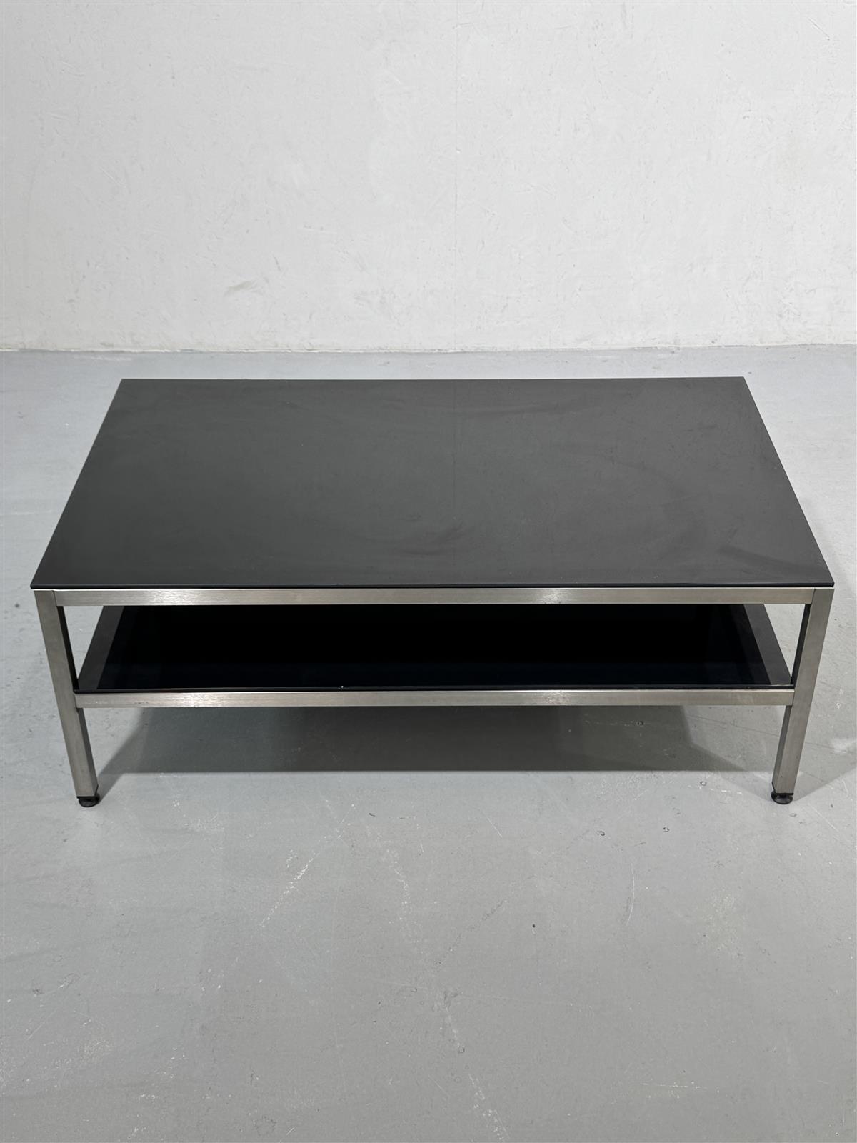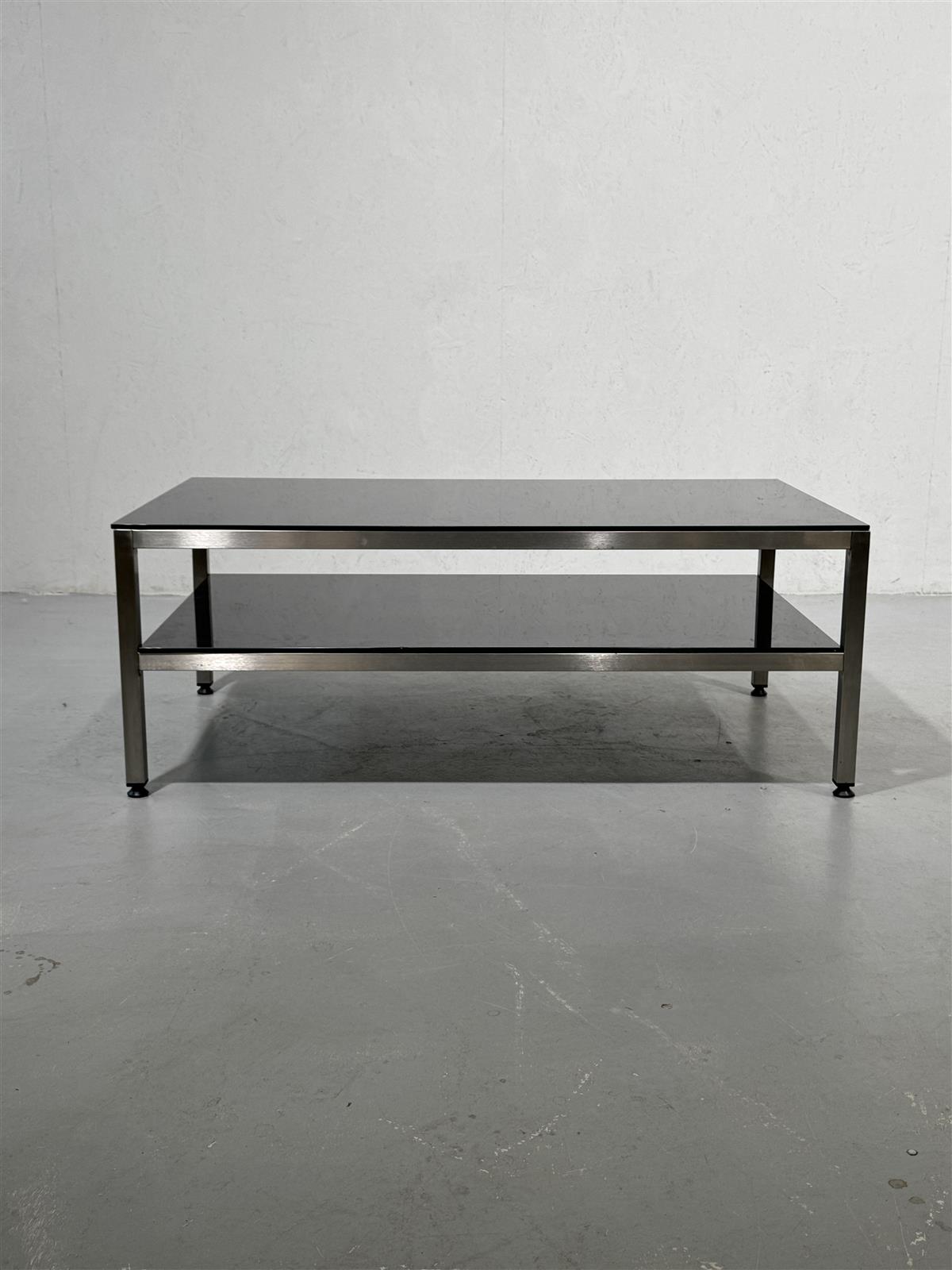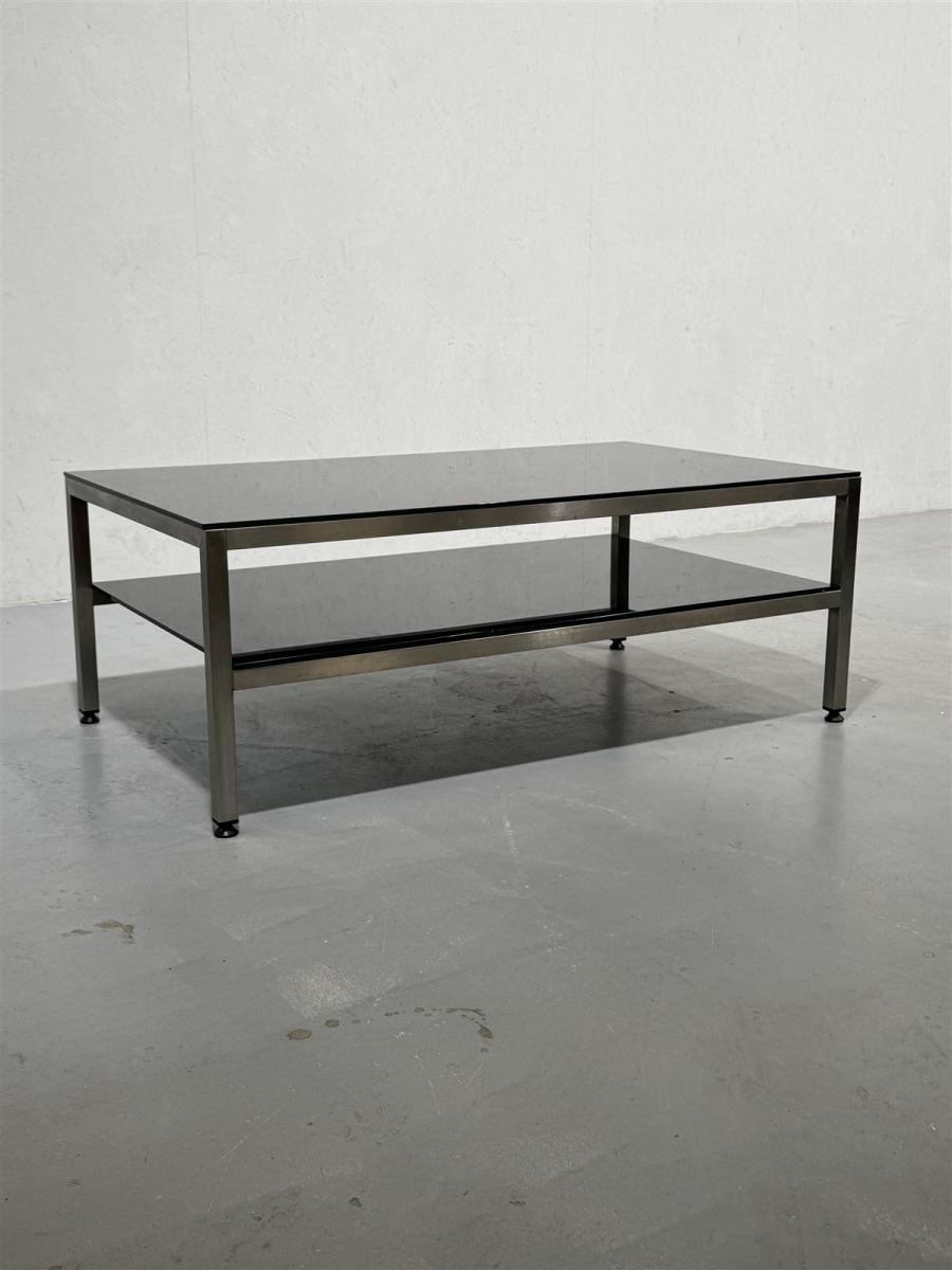 Moderni sohvapöytä, jossa on musta lasinen pöytälevy ja metallinen, kromi runko. Pöydän alapuolella on kätevä taso, joka tarjoaa lisää säilytystilaa. Pöydän muotoilu on yksinkertainen ja tyylikäs, sopien monenlaisiin sisustuksiin.