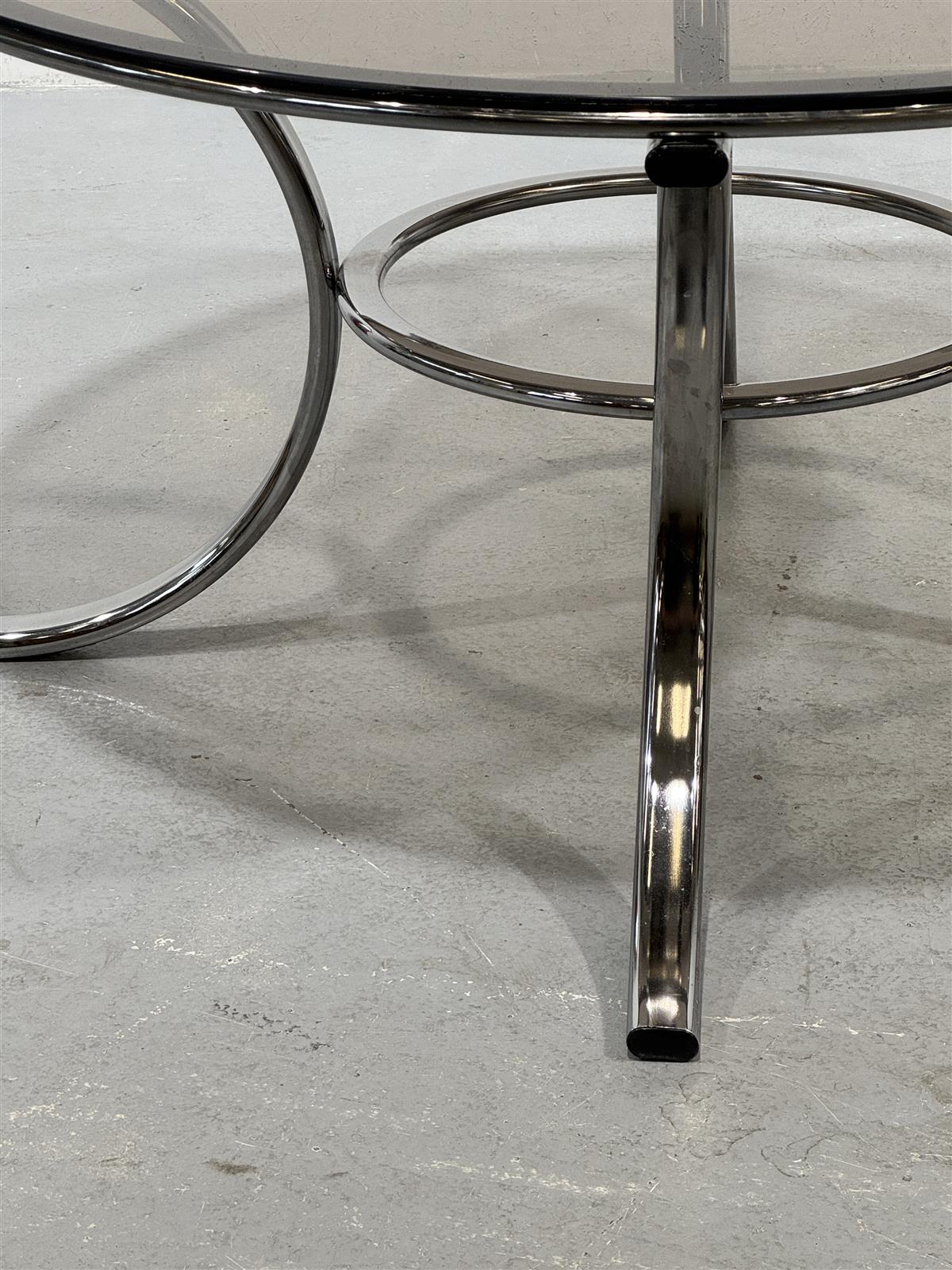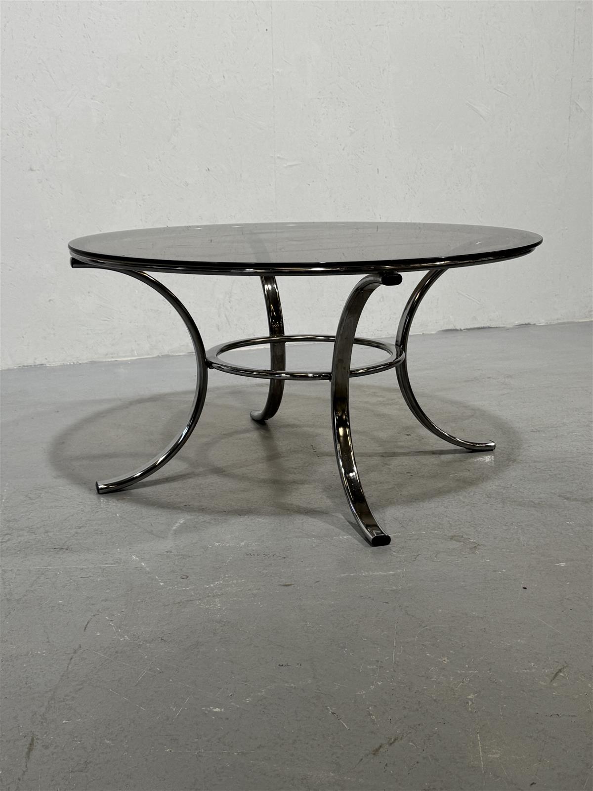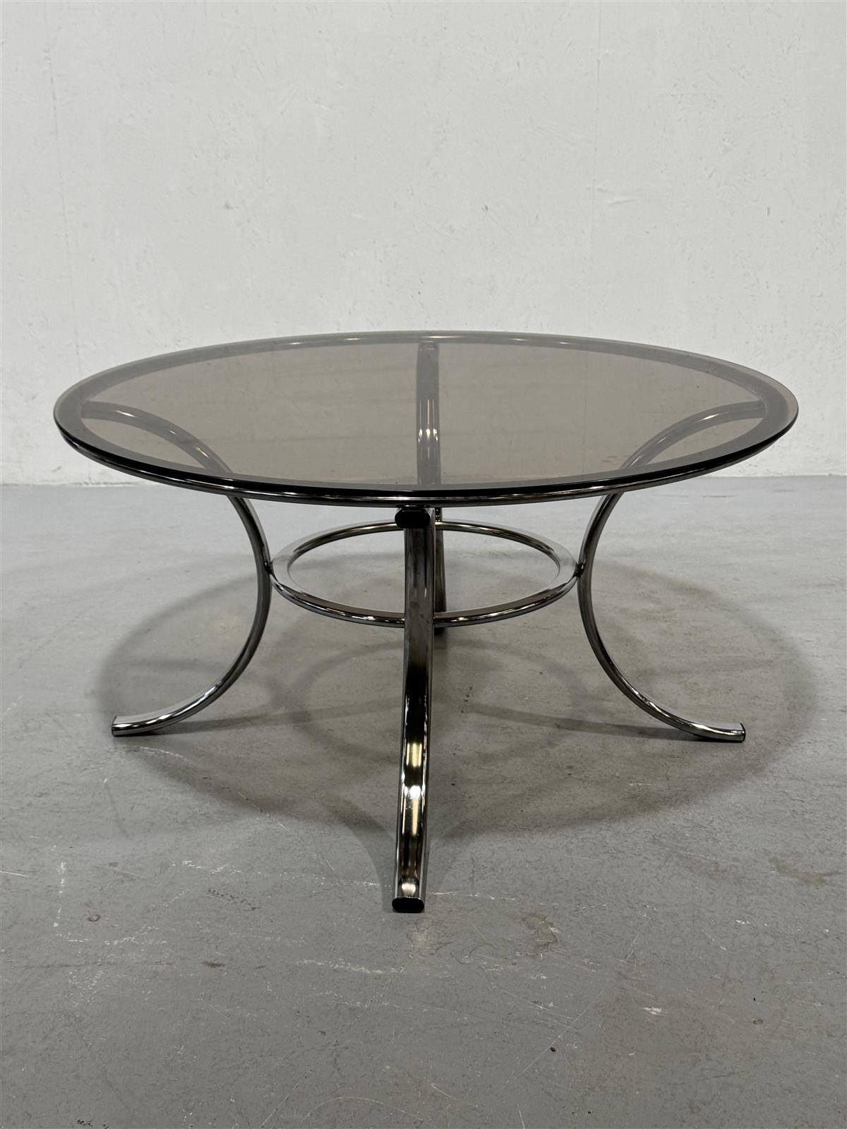 Pyöreä sohvapöytä, jossa on lasikansi ja tumma metallinen runko. Pöydän lasi on savunvärinen, mikä antaa sille modernin ilmeen. Metallijalat ovat kaarevat ja tukevat, luoden kevyen ja ilmavan vaikutelman.