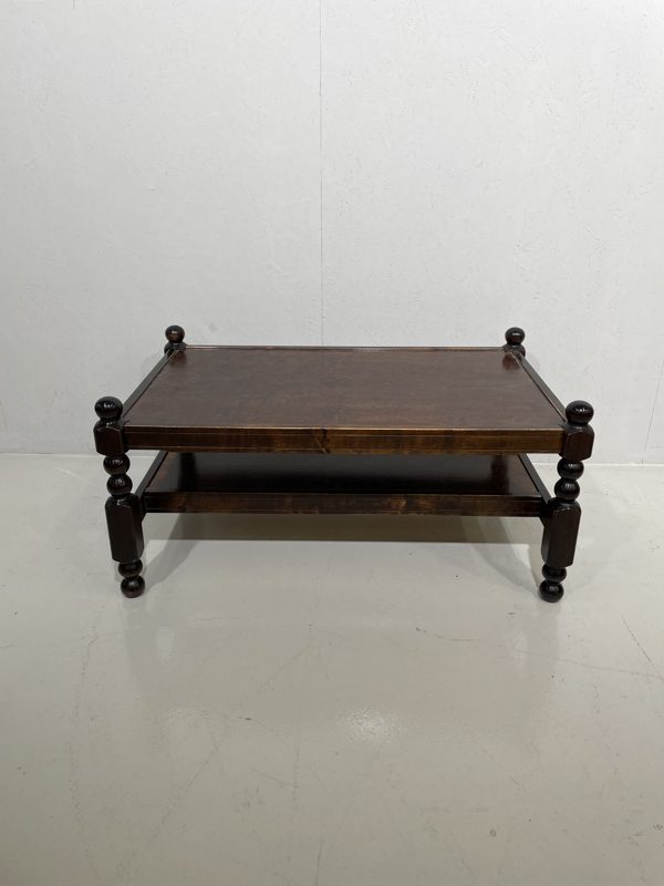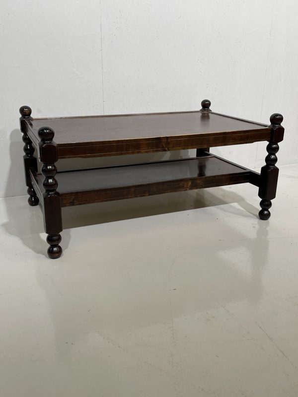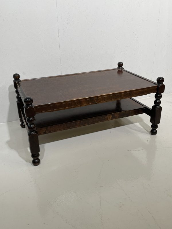 Puinen sohvapöytä, jossa kauniisti koristeiset puujalat. Arviolta 70/80 lukua. Kaksi tasoa.