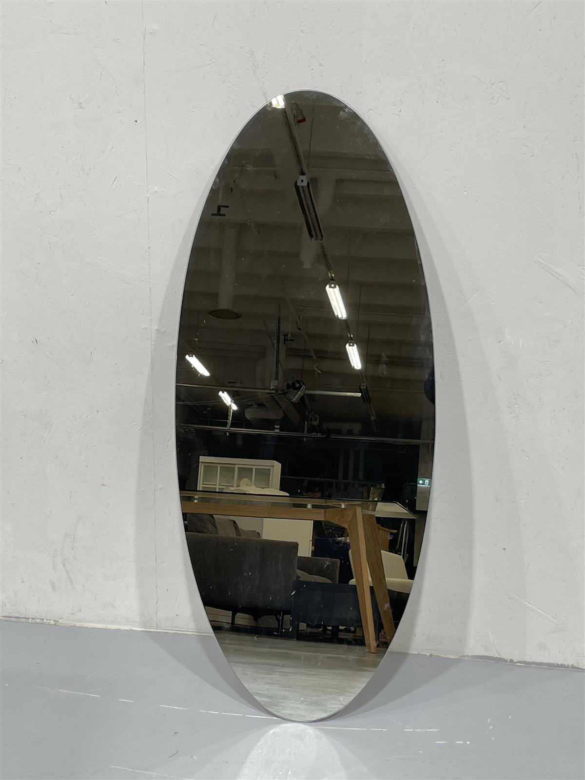 Soikea peili, joka on suunniteltu seinälle kiinnitettäväksi. Peilin tausta on valmistettu tukevasta materiaalista, ja siinä on kiinnityskoukut yläosassa. 50x120cm.