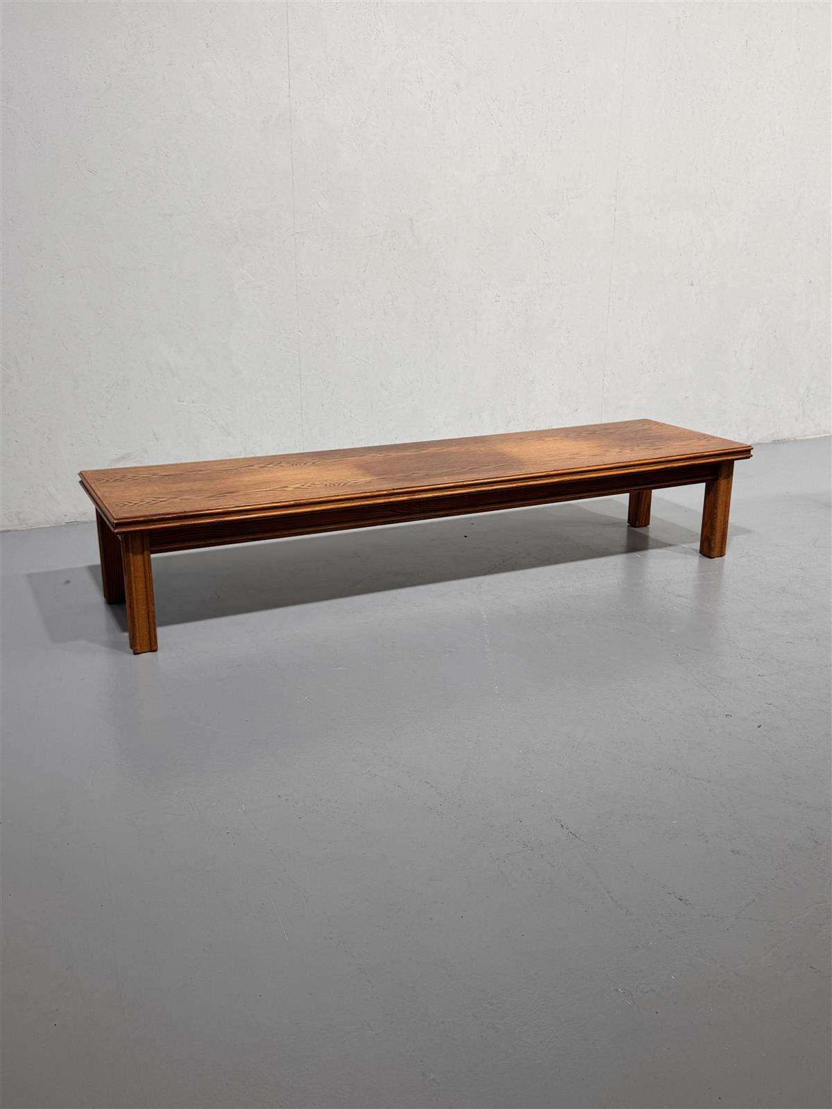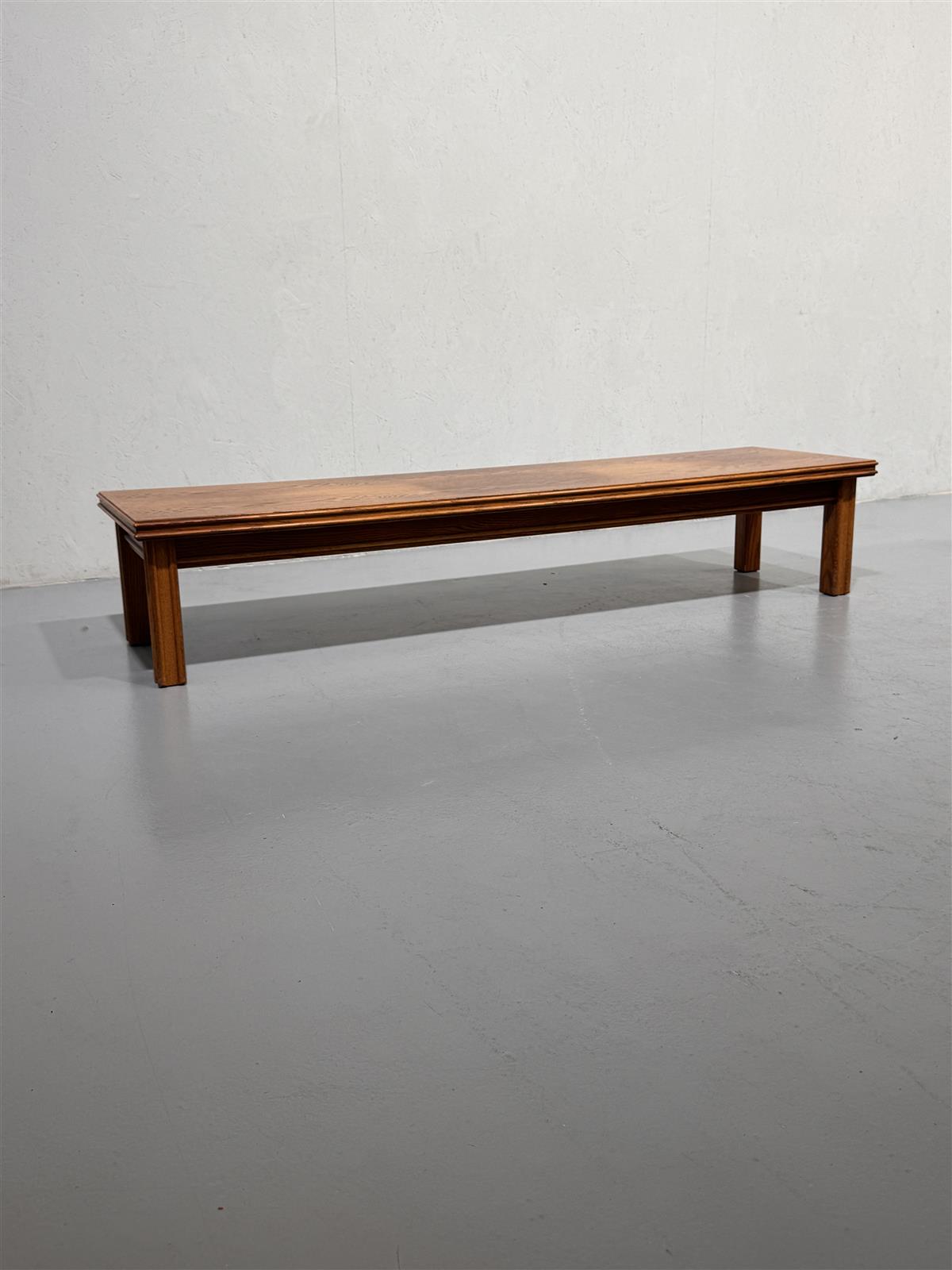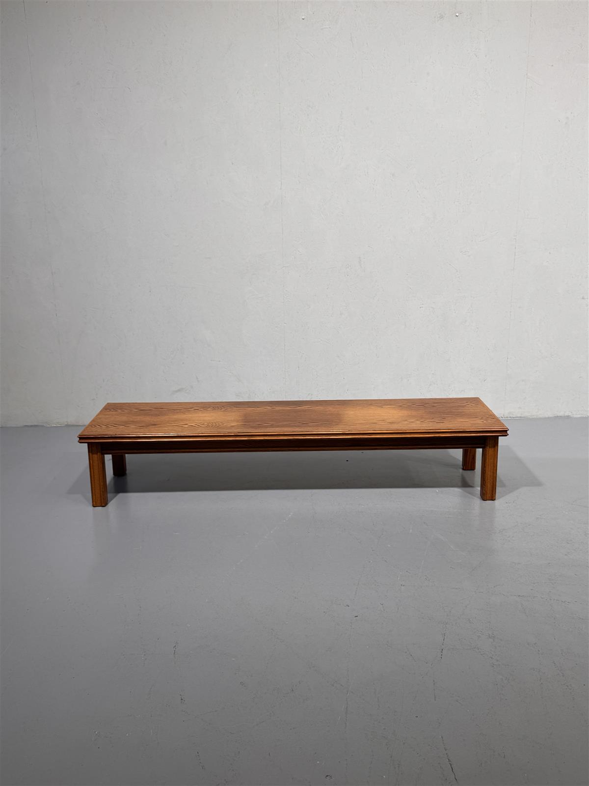 Pitkä puinen Sope Tower sivupöytä tai tukeva penkki, joka edustaa 70-luvun muotoilua. Sen yksinkertainen ja suoraviivainen muotoilu on tyypillinen aikakaudelle, jolloin käytännöllisyys ja selkeät linjat olivat keskiössä.