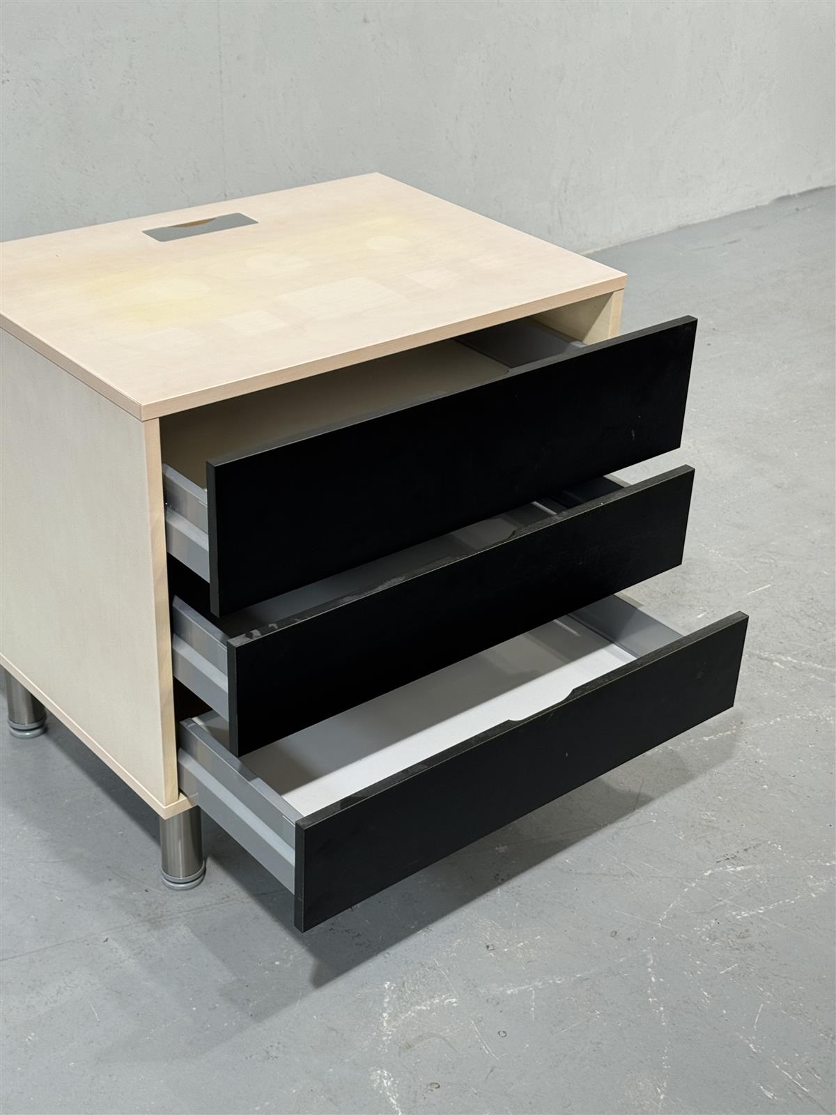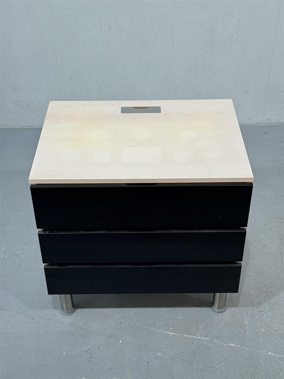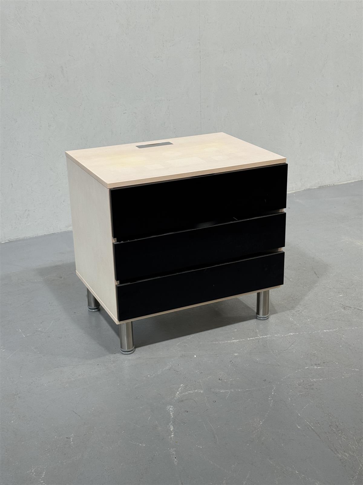 Moderni, raskasrakenteinen lipasto, jossa on kolme mustaa, syvää vetolaatikkoa hidastimilla ja vaalea pinta. Tukevat metallijalat, joissa säätöä, antavat sille vakautta ja tyylikkyyttä. Tarjoaa runsaasti säilytystilaa.