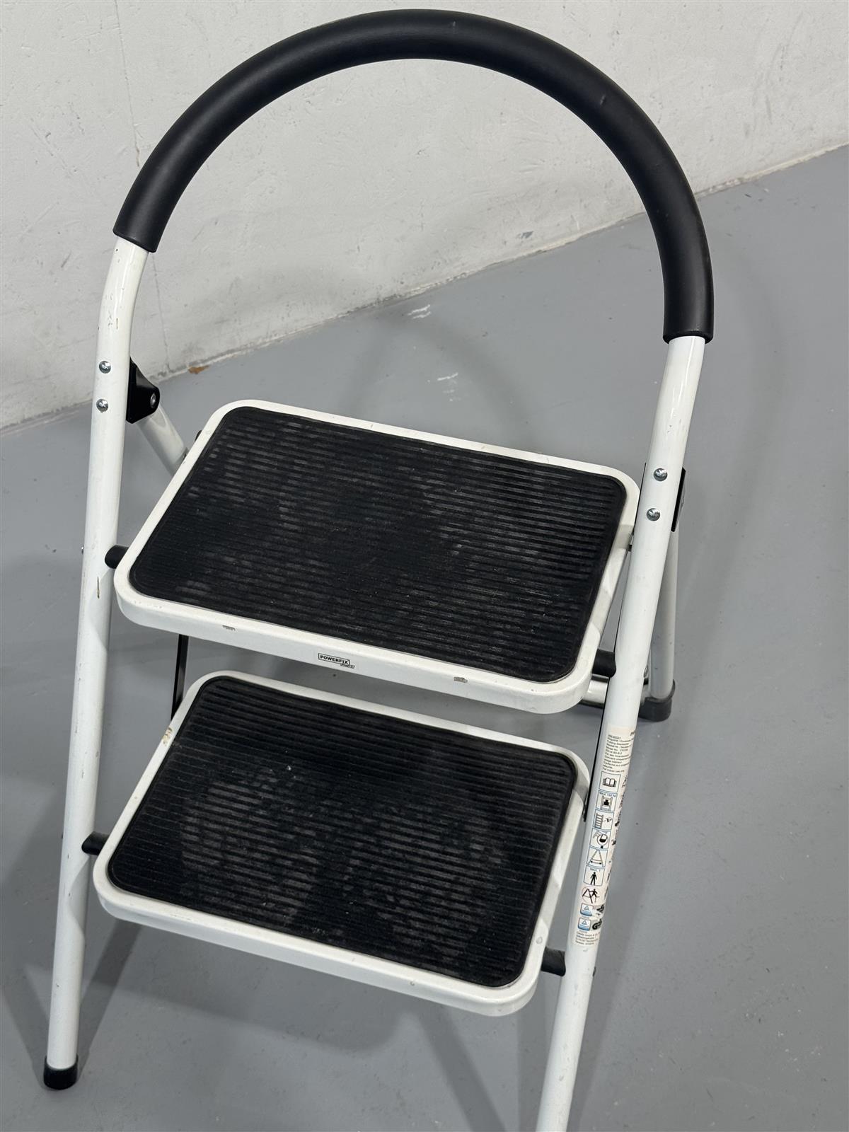 Käytännölliset taitettavat askeltikkaat, joissa on kaksi askelmaa. Runko on valmistettu kestävästä metallista ja askelmat ovat mustaa muovia, mikä tarjoaa hyvän pidon. Tikkaat ovat kevyet ja helposti siirrettävät, ja ne voi taittaa kasaan säilytystä varten.