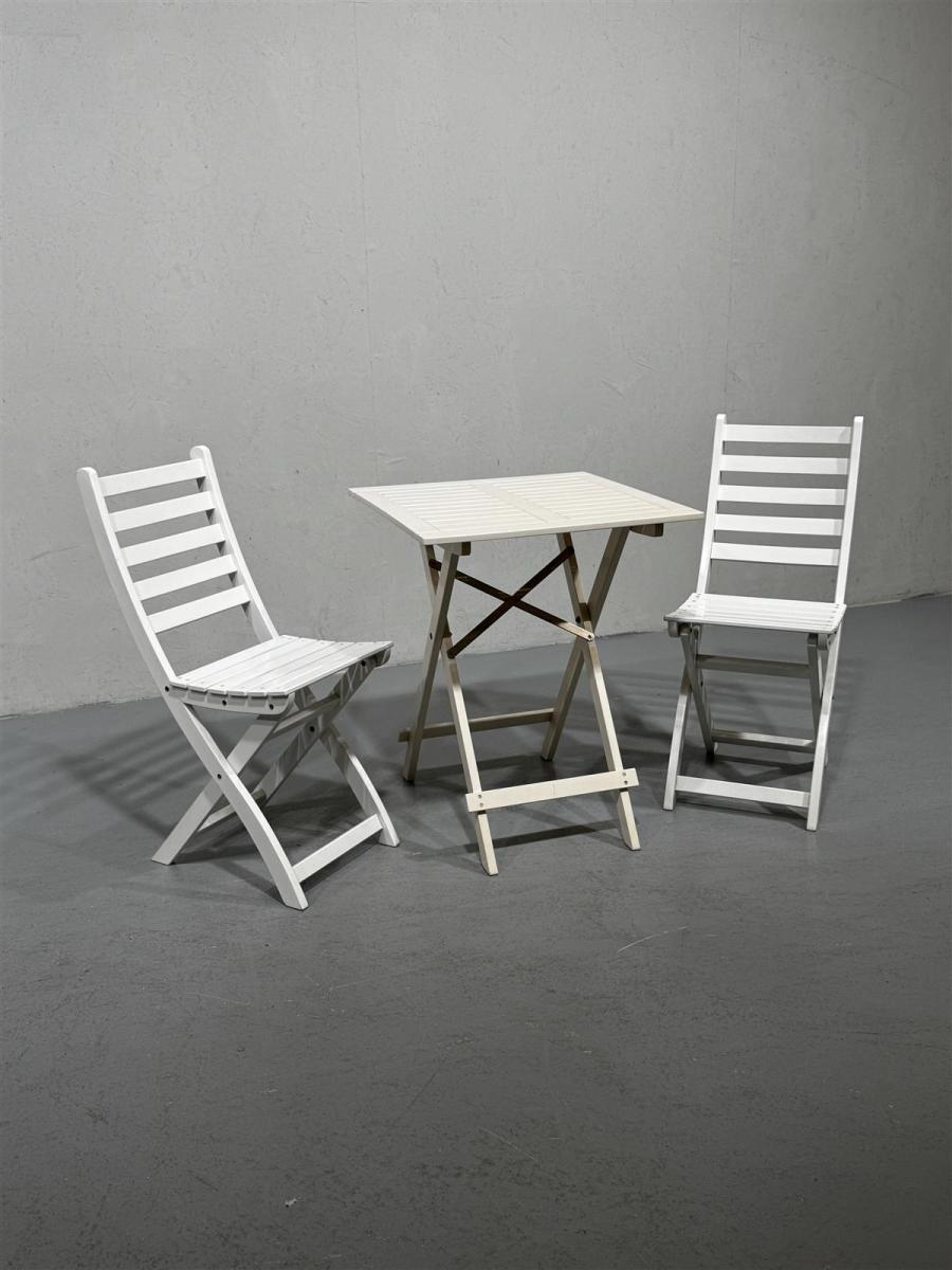 Käytännöllinen puutarhakalustesetti, joka sisältää kaksi taittotuolia ja pienen taittopöydän. Setti on valmistettu puusta ja maalattu valkoiseksi, mikä antaa sille raikkaan ilmeen. Tämä setti sopii erinomaisesti pienelle parvekkeelle tai terassille. Valkoinen väri tuo esiin puun luonnollisen kauneuden ja tekee siitä helposti yhdisteltävän muiden ulkokalusteiden kanssa.