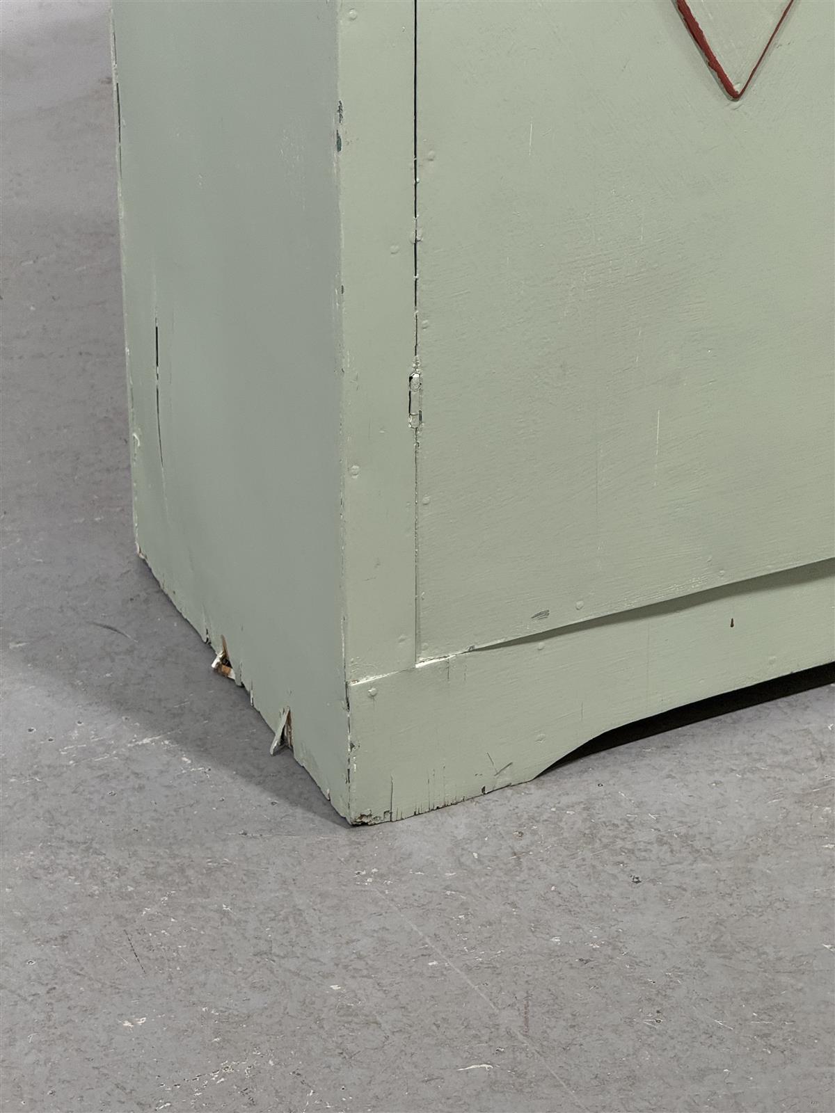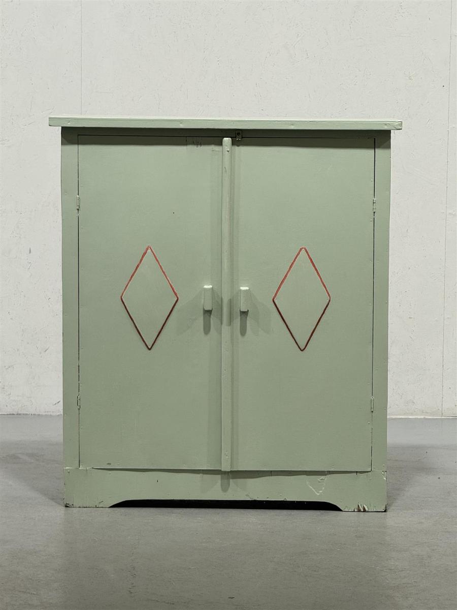 Kaksiosainen vihreä kaappi, jonka etuosassa on koristeellisia kuvioita kädensijojen vieressä. Oven reunat ovat suorat, ja kaapissa on yksinkertainen ja symmetrinen muotoilu.