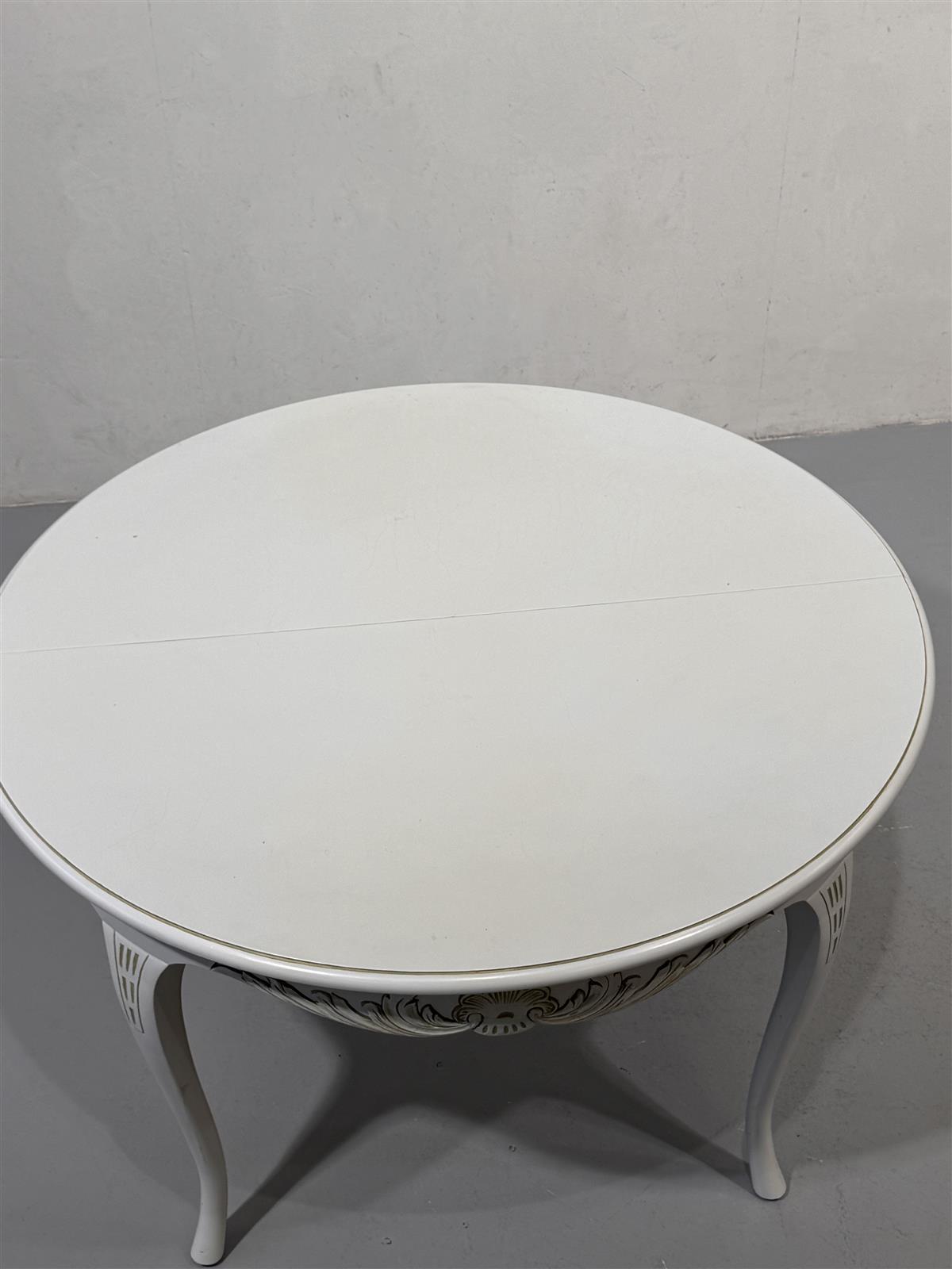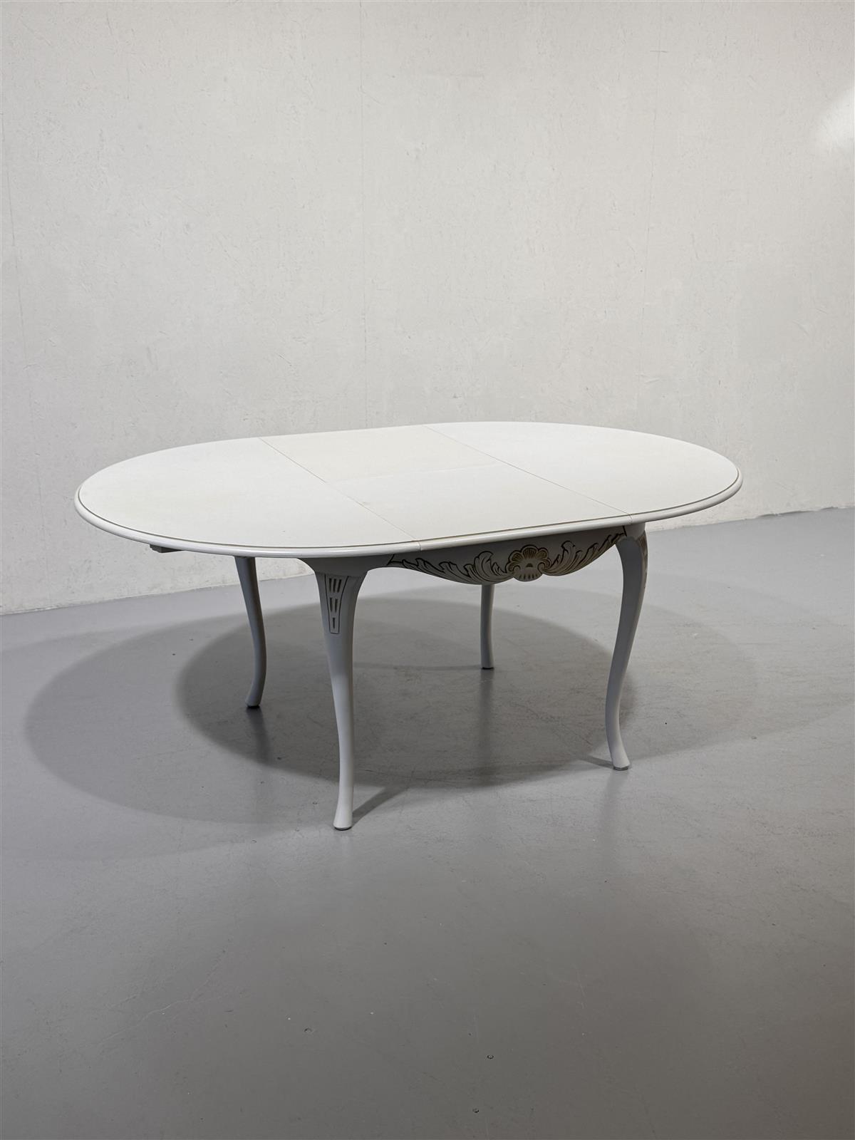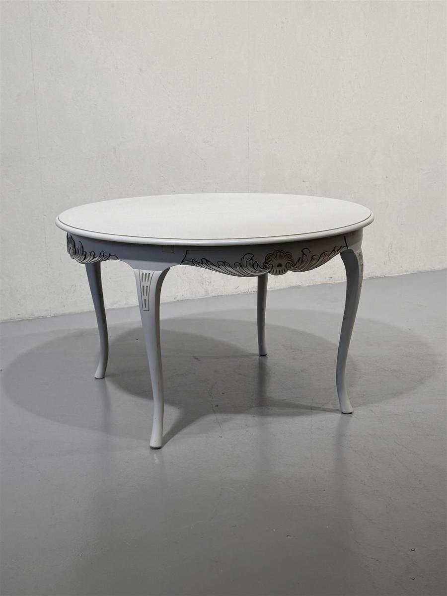 Tyylikäs pyöreä talonpoikaisrokokoo tyylin ruokapöytä, jossa on koristeelliset jalat ja kauniit yksityiskohdat. Pöytälevy on vaalea sininen ja siinä on hienovaraisia koristekuvioita reunoilla. Tason maalipinnassa krakelointia ja kulumaa, otettu huomioon hinnassa. Pöydän sisällä lisäosa +52cm, siisti.