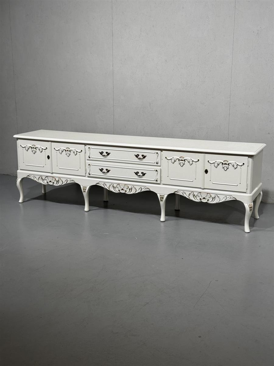 Valkoinen talonpoikasirokokoo-tyylinen senkki, jossa on koristeelliset jalat ja kaiverrukset. Senkissä on kaksi ovea ja vetolaatikkoja keskellä.