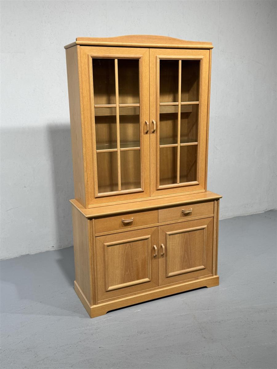 Kaappi on hyvässä kunnossa, mutta siinä on pieniä käytön jälkiä, kuten naarmuja ja kulumia, jotka ovat tyypillisiä vanhemmille huonekaluille. Lasi on ehjä ja puupinta on säilynyt siistinä.