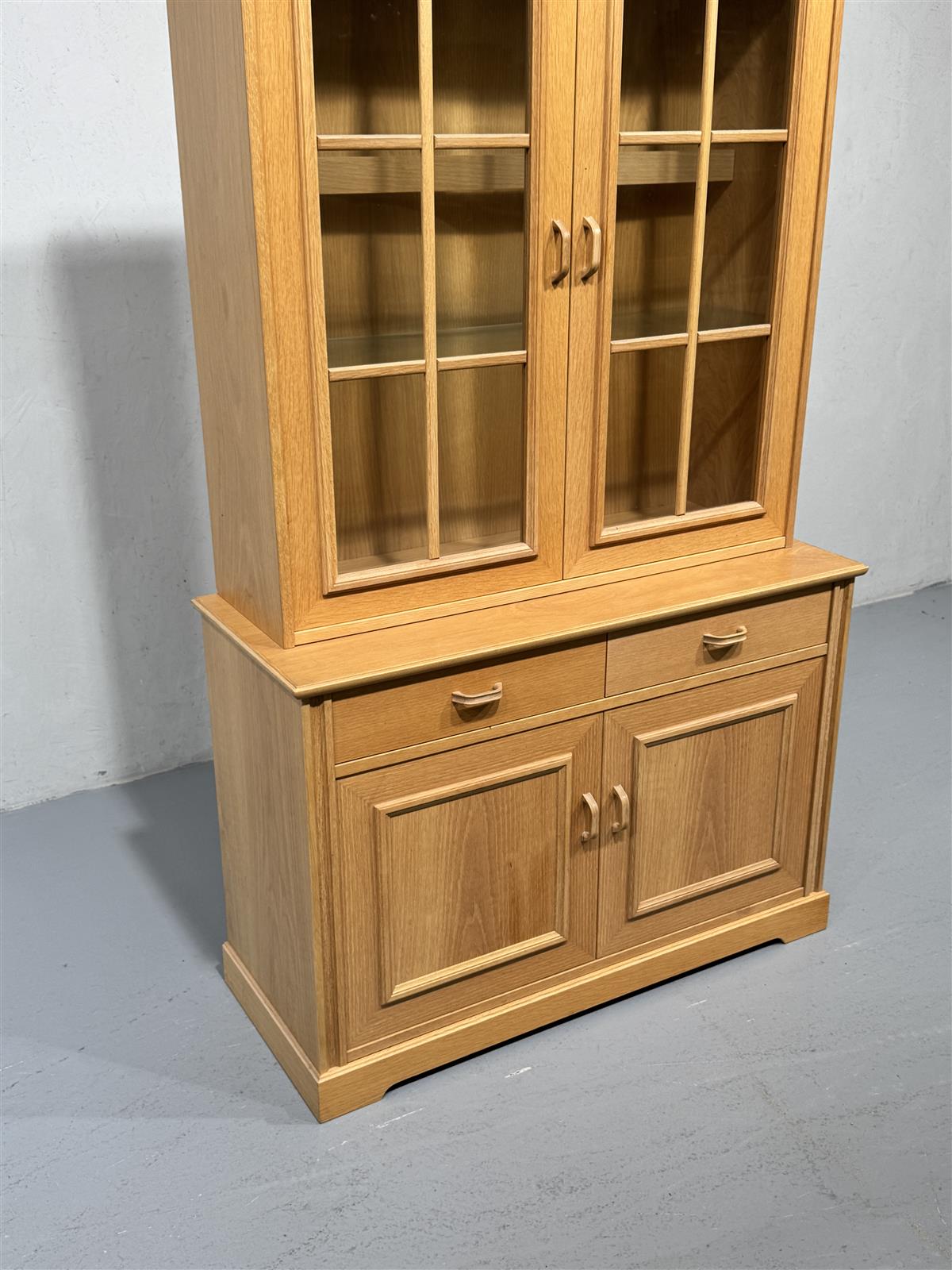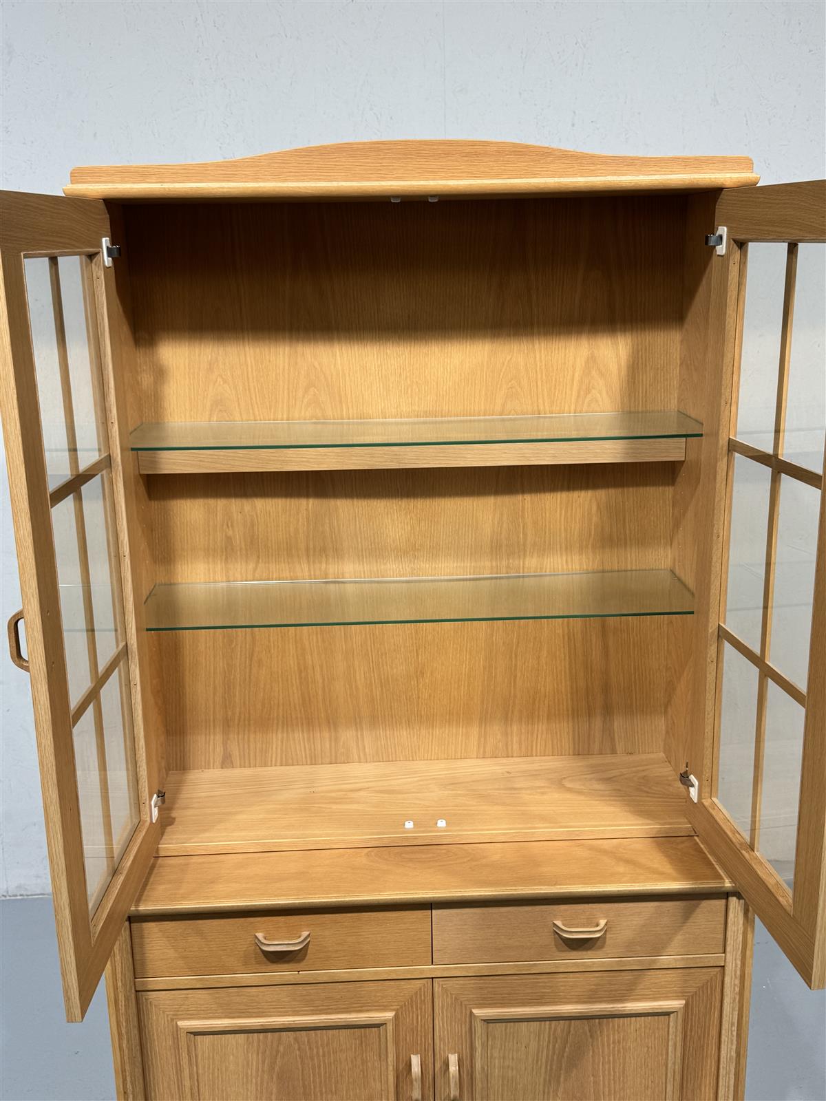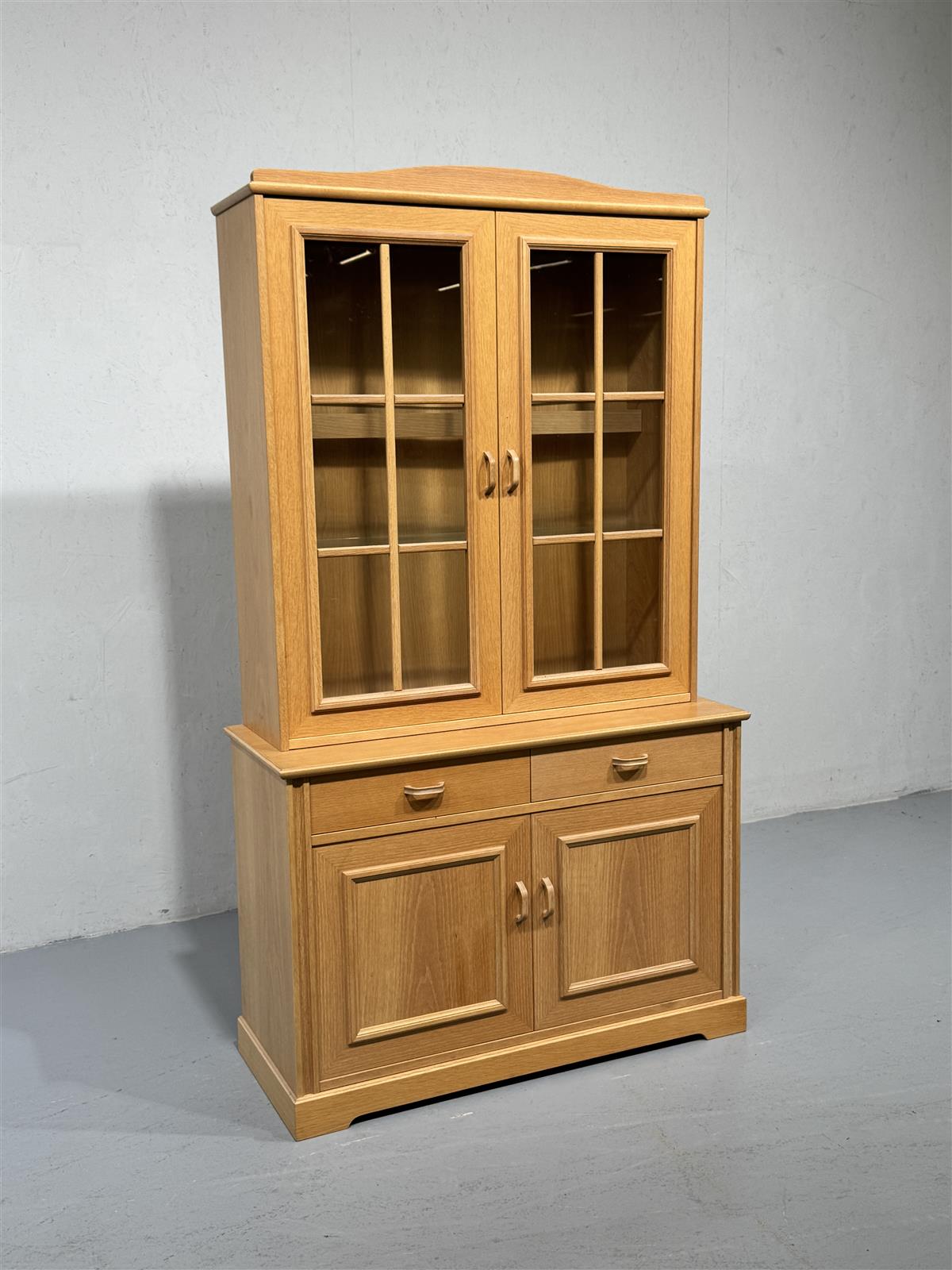 Korkea talonpoikaistyyliä edustava astiakaappi, jossa on lasiovet ja puinen runko. Kaapissa on kaksi lasihyllyä yläosassa ja alhaalla kaksi vetolaatikkoa sekä kaappiovet, jotka tarjoavat runsaasti säilytystilaa. Lasiovet antavat kaapille kevyen ilmeen ja mahdollistavat esineiden esillepanon.