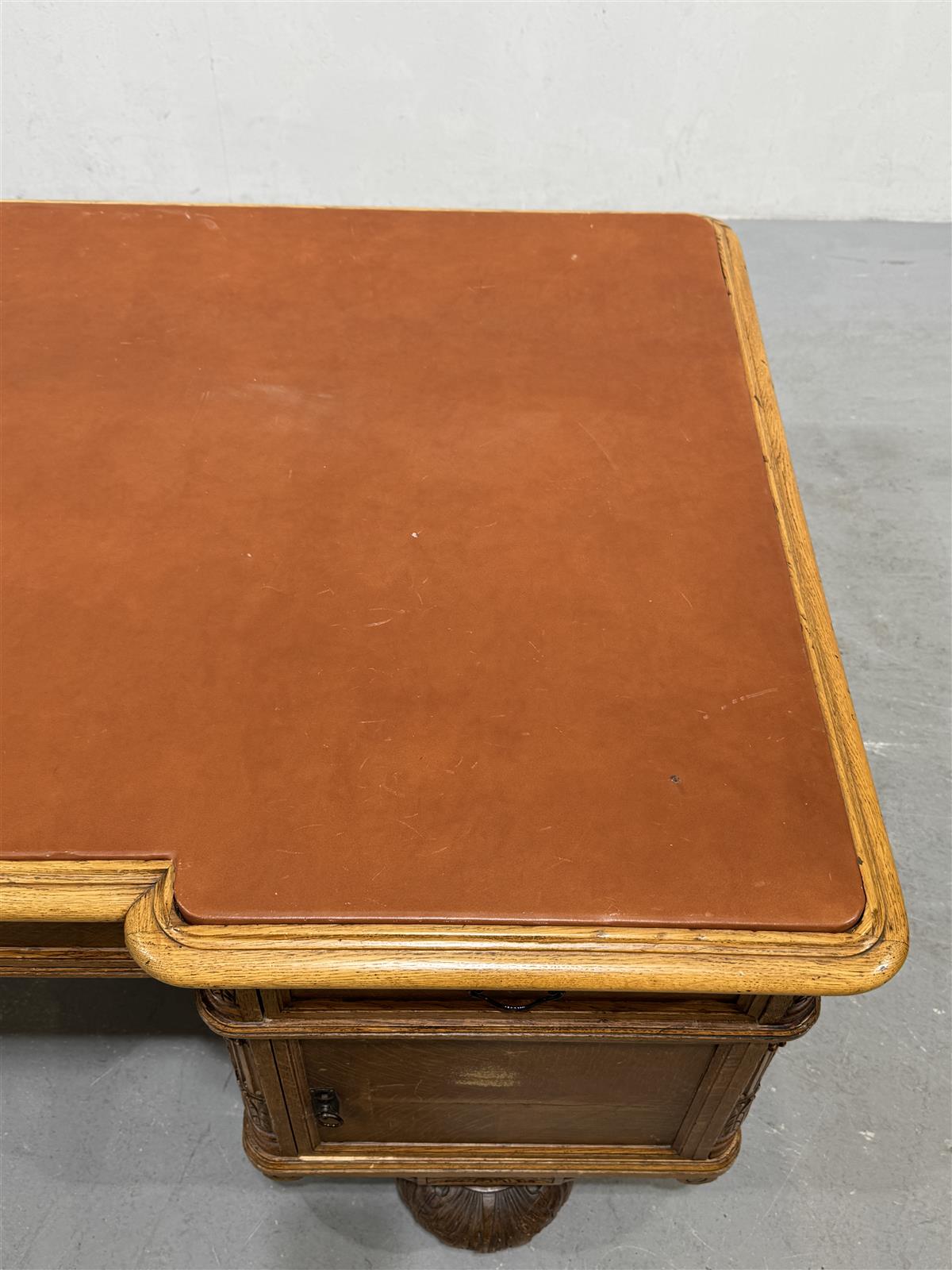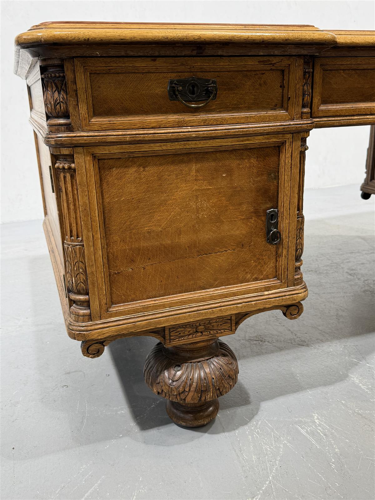 Tukeva tammipuusta valmistettu kirjoituspöytä, jossa on koristeelliset jalat ja useita erittäin syviä vetolaatikoita. Pöydän kansi on päällystetty konjakin värisellä ruskealla nahalla, mikä antaa sille arvokkaan ilmeen. Pöydän runko on valmistettu paksusta tammipuusta, ja siinä on kauniita yksityiskohtia, kuten kaiverrettuja koristeita ja metallisia vetimiä.