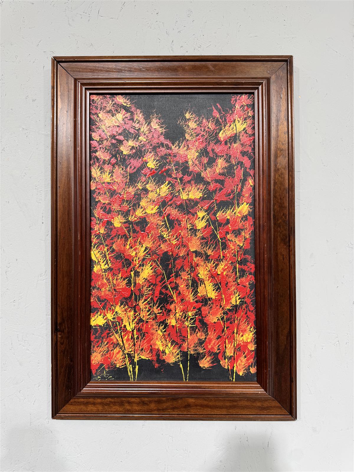 Värikäs tumma maalaus, jossa on punaisia ja keltaisia sävyjä tummalla taustalla. Teos on kehystetty tummalla puukehyksellä, joka korostaa maalauksen intensiivisiä värejä.
