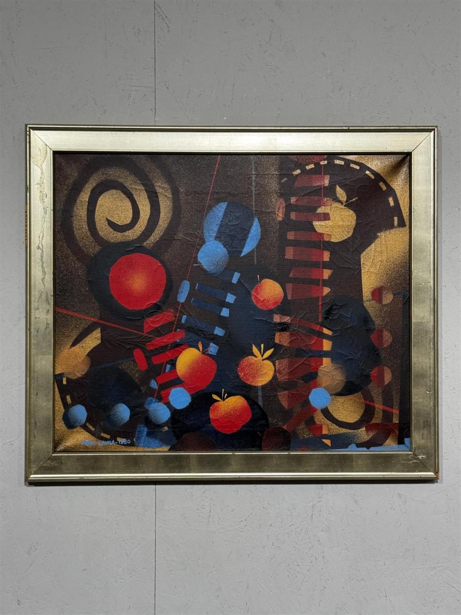 Öljyvärimaalaus kankaalle, jonka on signeerannut Kari Lavila vuonna 1980. Teos esittää abstrakteja muotoja ja värejä, kuten punaisia ja sinisiä ympyröitä sekä keltaisia ja oransseja elementtejä.