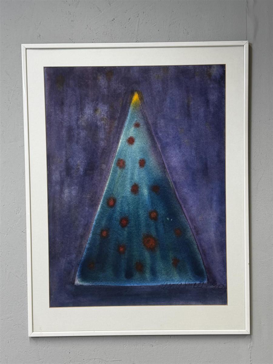 Värikäs teos, jossa on sininen kolmio ja punaisia pisteitä tummalla taustalla. Alareunassa signeeraus ’Anja Snell -90’. Kehystetty valkoisella kehyksellä, joka korostaa teoksen värejä ja muotoja.