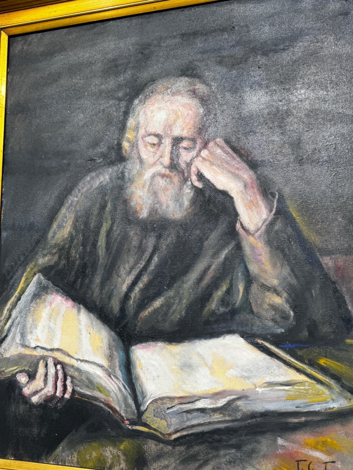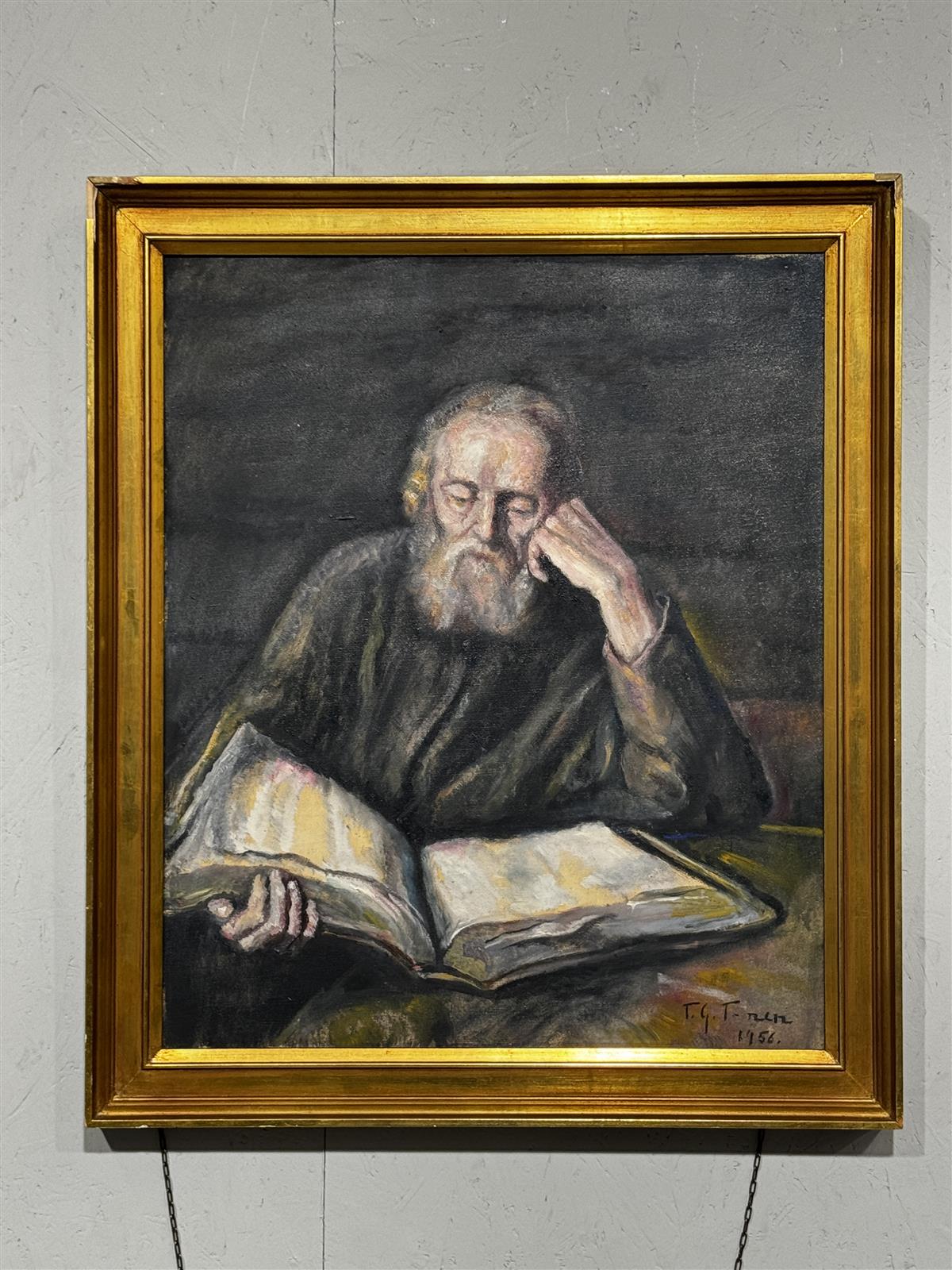 Öljyvärimaalaus kankaalle, signeerattu Toivo Tuhkanen vuonna 1956. Teos on ”Erakko” eli Salomon Koninckin 1643 työstä tehty kopio, vanha mies lukemassa kirjaa . Kehystetty kultaisella kehyksellä.