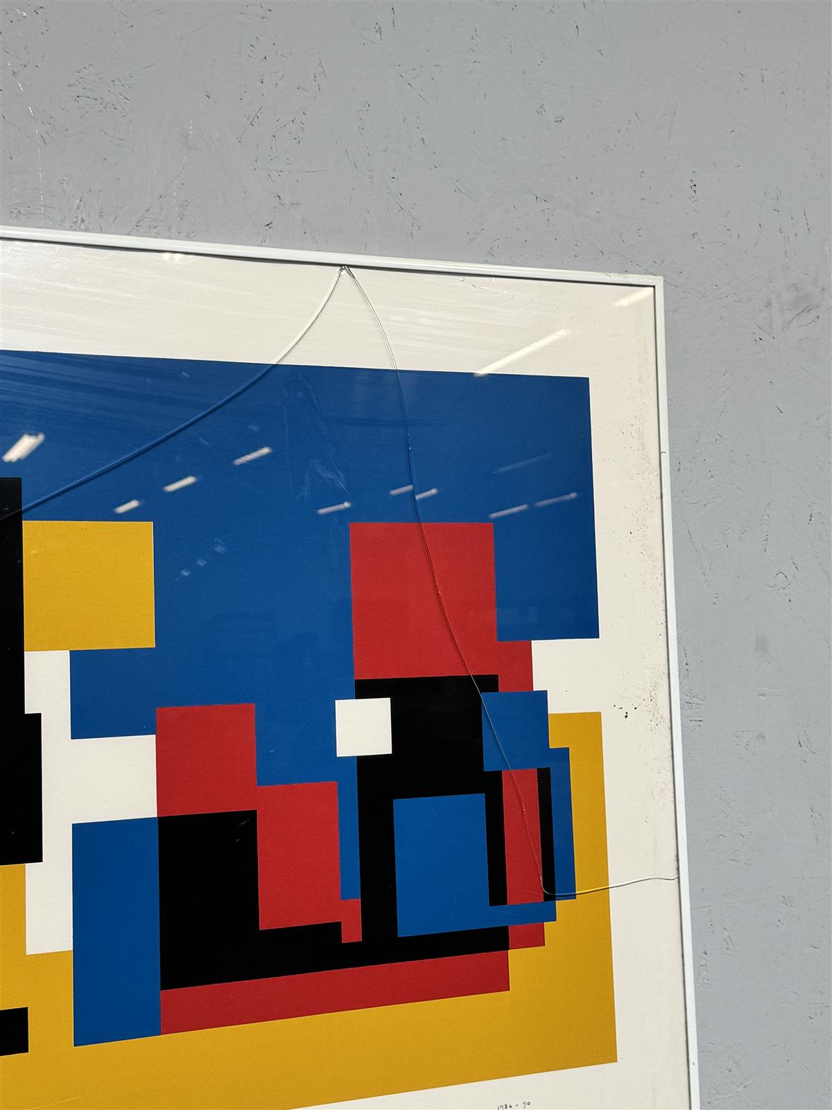 Kehyksessä on näkyvä halkeama, joka vaikuttaa teoksen esillepanoon. Postitettaessa mahdollisesti lasi poistetaan ennen lähetystä.