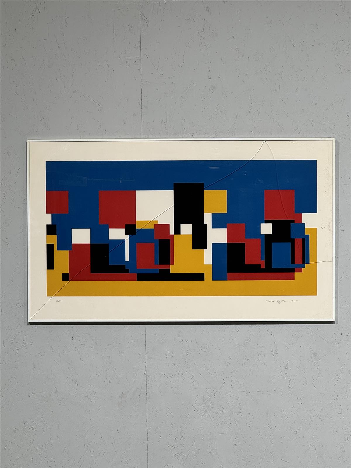 . Kehystetty valkoiseen kehykseen, joka korostaa teoksen värejä ja muotoja.
