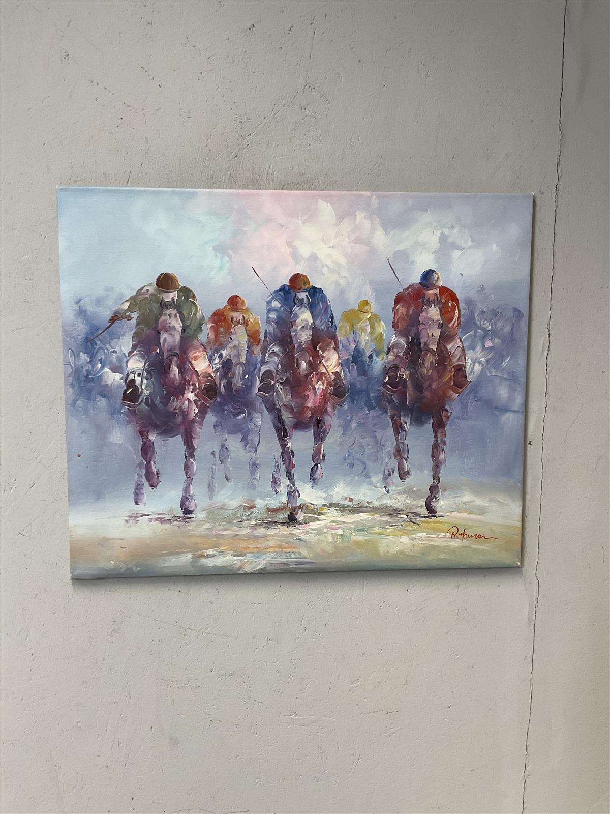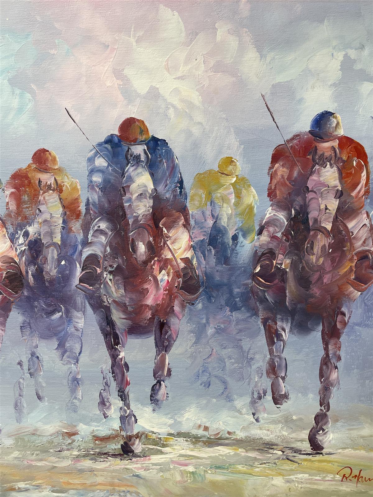 Öljyvärimaalaus, jossa kuvataan hevoskilpailua. Maalauksessa on useita hevosia ja ratsastajia värikkäissä asuissa.