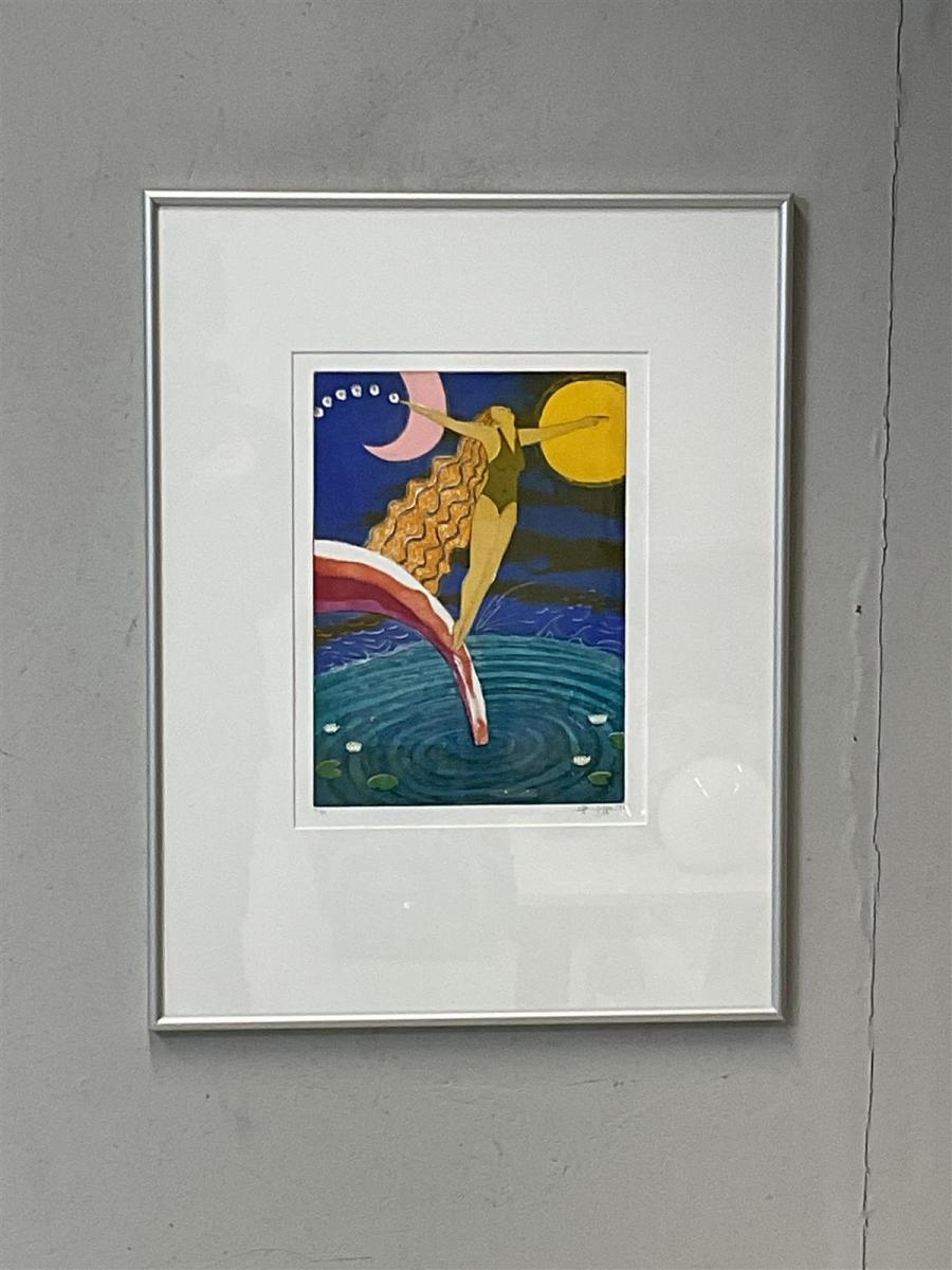 Taioteilija Hanna Variksen teos ”Hyppy tulevaisuuteen” etsaus 1997. Numeroitu vedos 41/50.