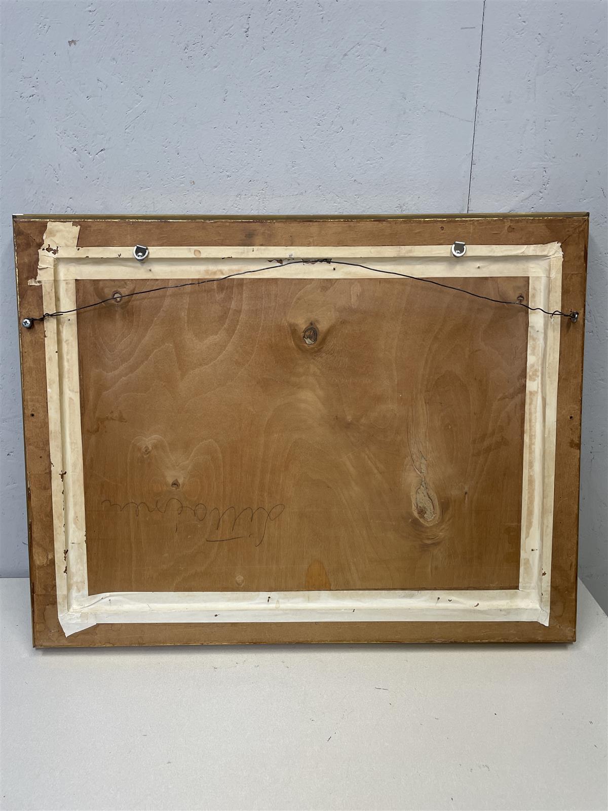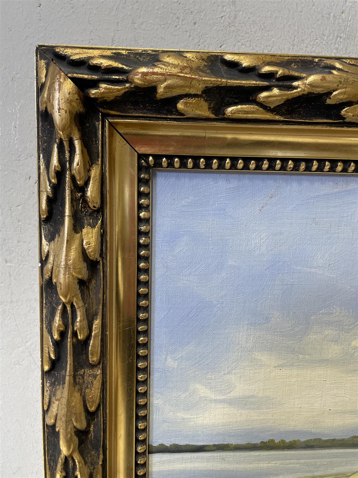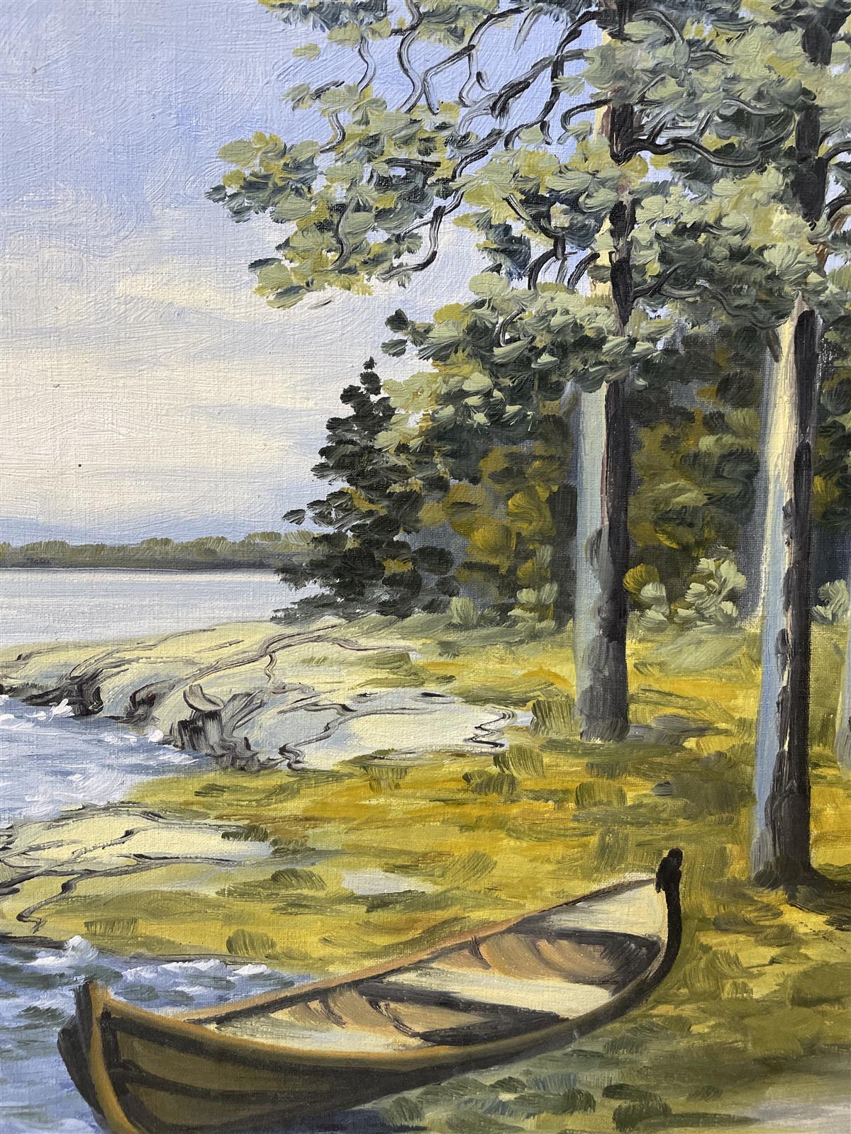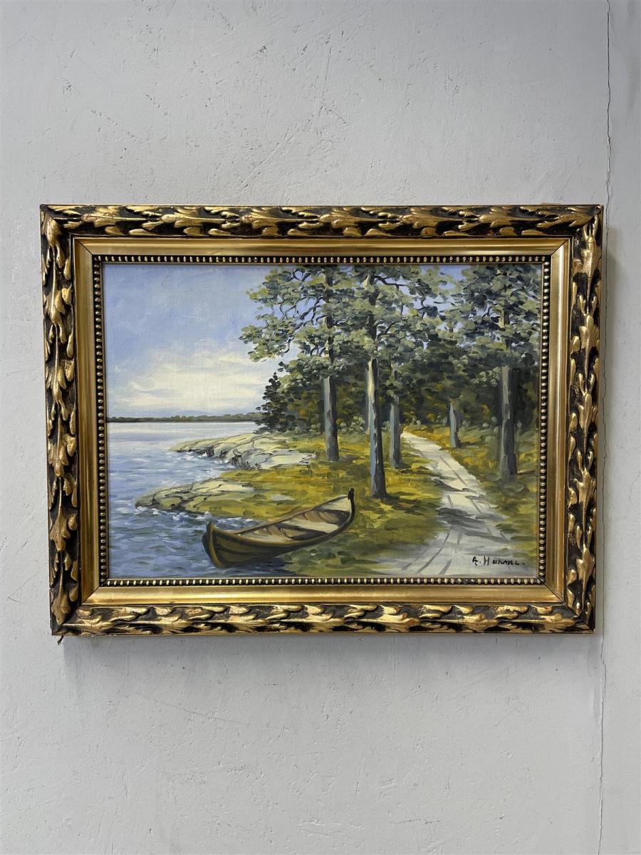 Öljyvärimaalaus kovapinnalle, jossa on kuvattuna järvimaisema veneellä ja puilla. Kehykset ovat koristeelliset ja kultaiset.
