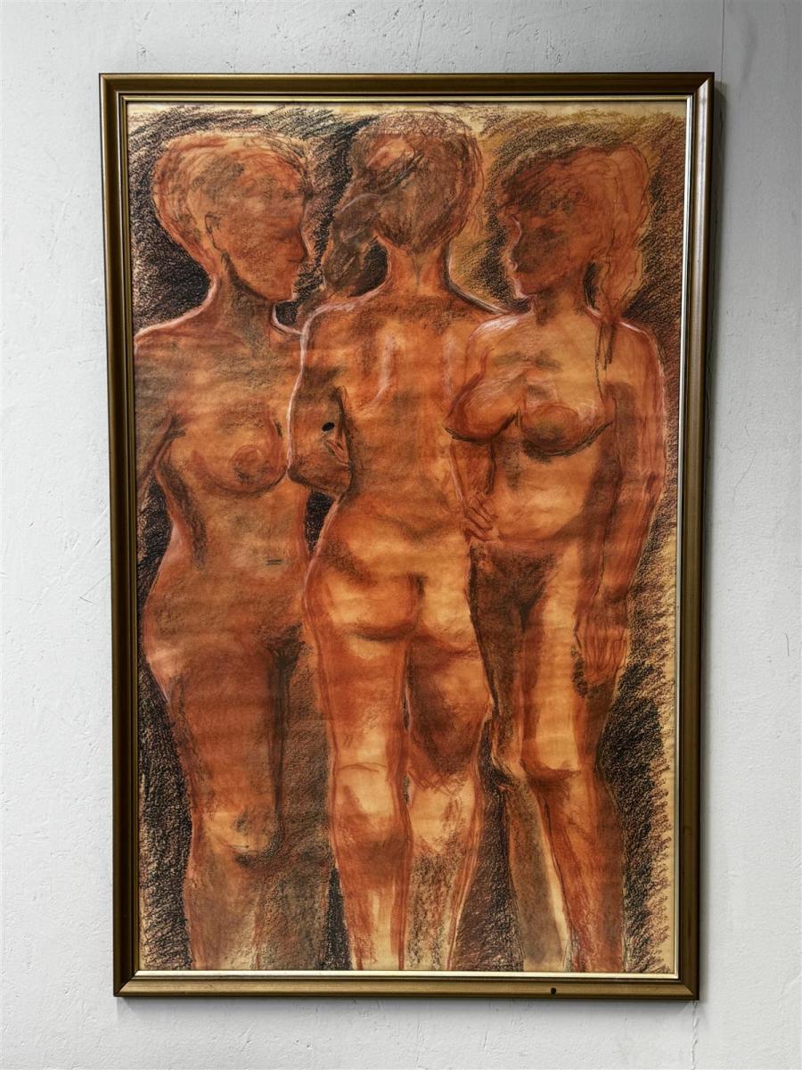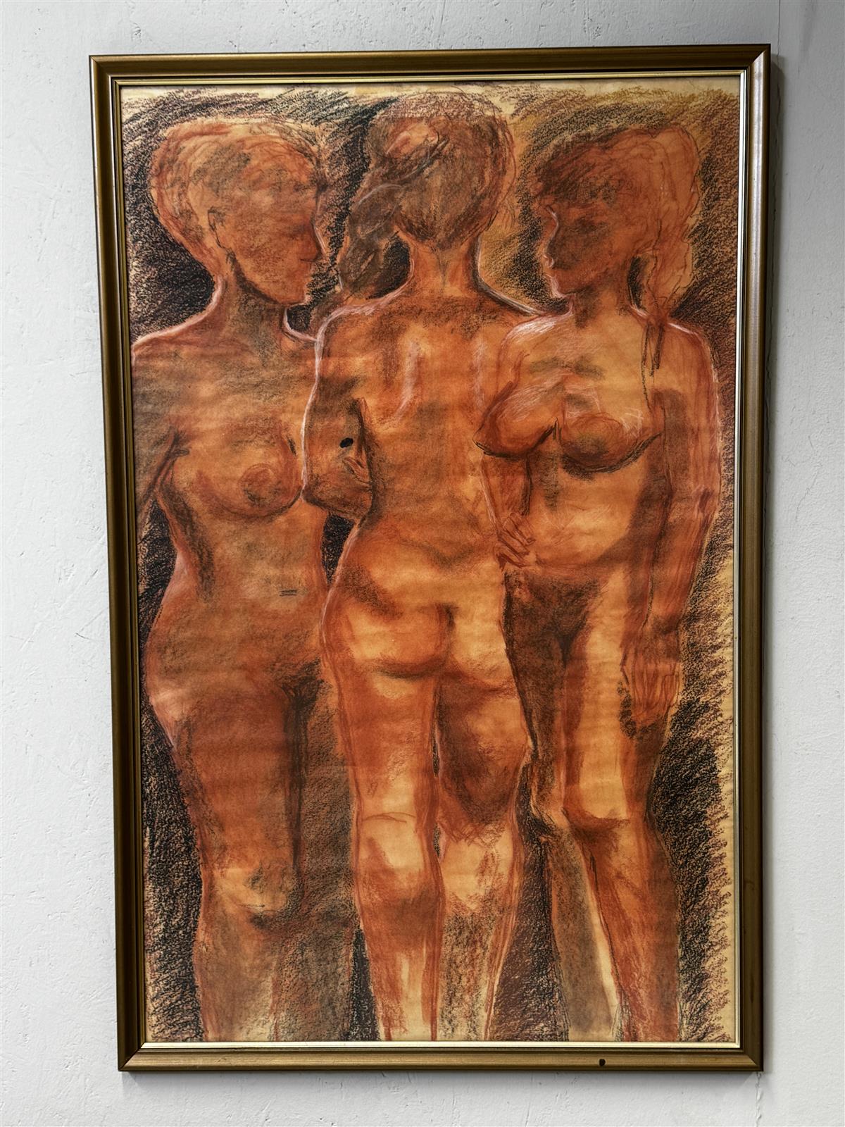 Kolme naista esittävä pastelli, jossa käytetty lämpimiä sävyjä ja voimakkaita viivoja. Kehystetty kultaisella kehyksellä, joka korostaa teoksen intensiivisyyttä ja syvyyttä. Piirustus on ilmeikäs ja vangitsee katsojan huomion välittömästi. Ei signeerausta.