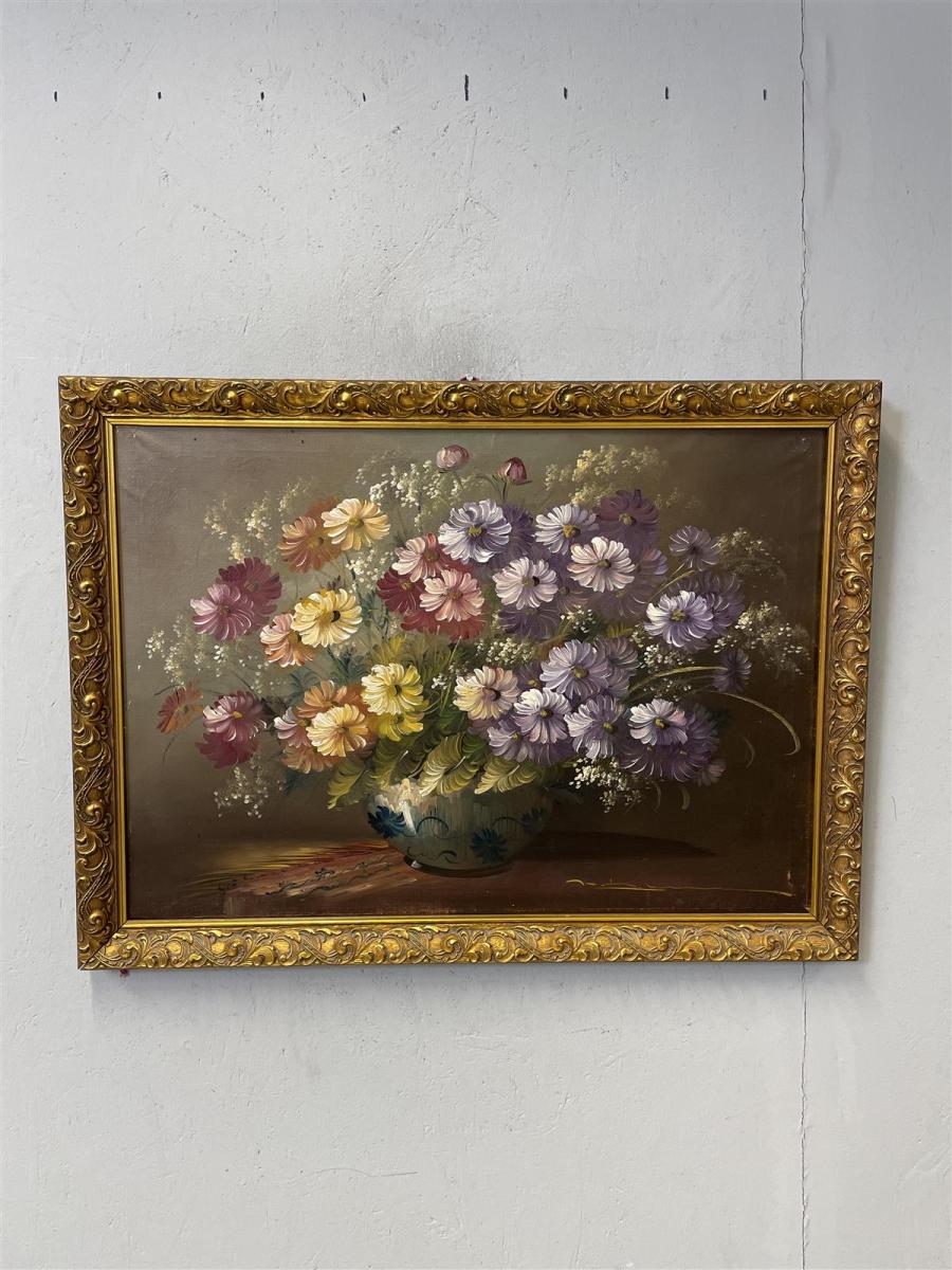 Öljyvärimaalaus kankaalle, jossa on kukka-asetelma. Kehystetty koristeellisella kehyksellä. Alareunassa signeeraus, mutta taiteilija ei ole tunnistettavissa.