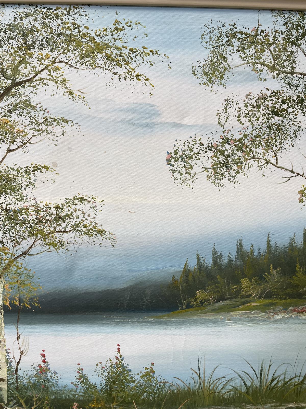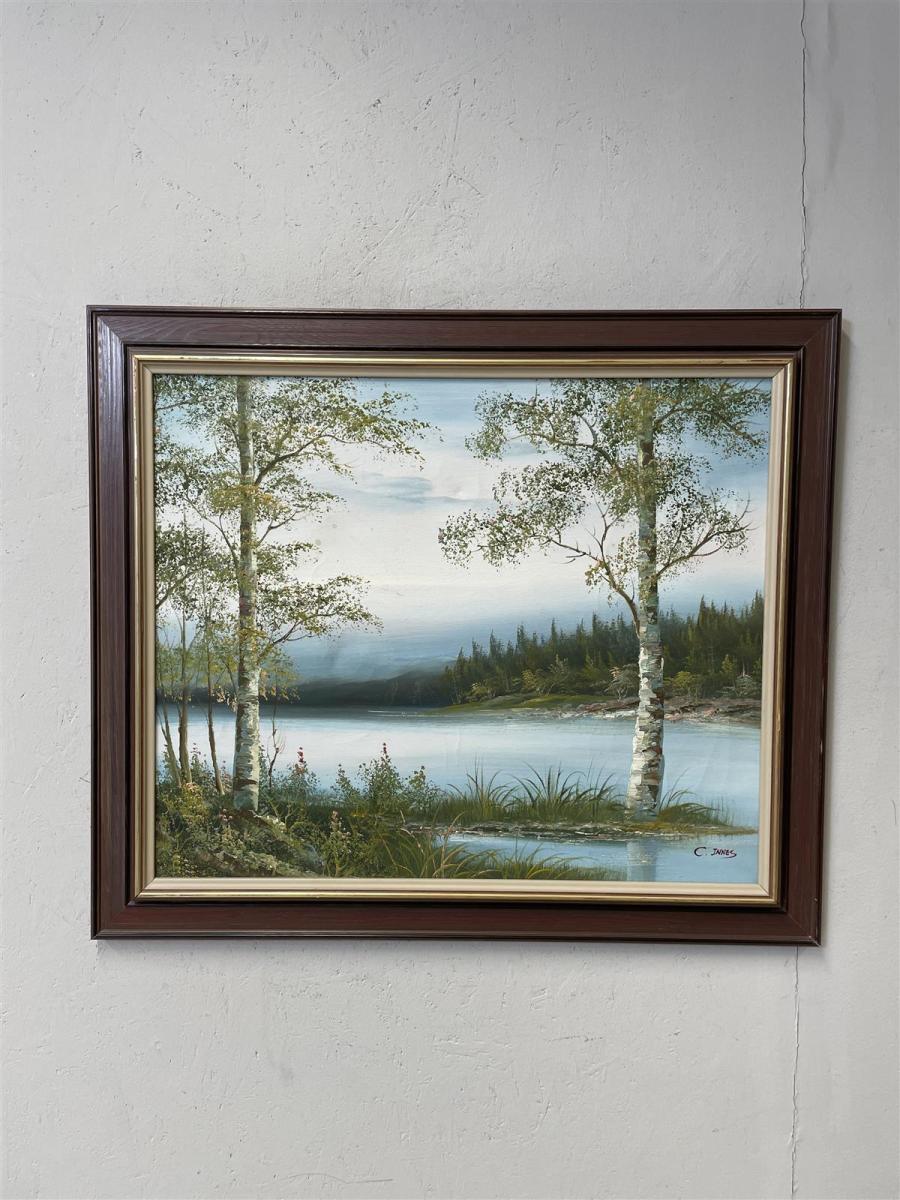 Taulu maisemamaalaus kankaalle, jossa näkyy järvimaisema ja koivuja. Signeeraus C. Innes.