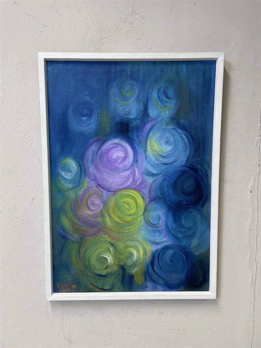Öljyvärimaalaus kovapinnalle. Teos esittää abstrakteja kukkia, pyörteitä ja värikkäitä muotoja sinisen, vihreän ja violetin sävyissä. Signeeraus epäselvä, 1972