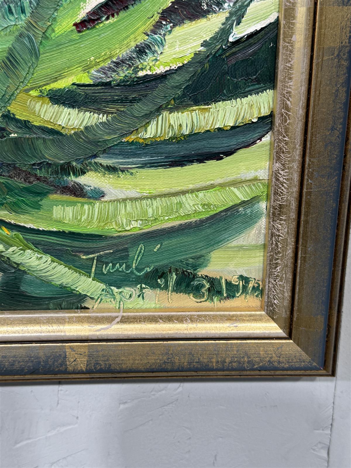 Öljyvärimaalaus kankaalle, signeeraus Tuuli 1972. Teos esittää vehreää maisemaa, jossa on kalliota ja kasveja. Kehystetty koristeellisella kehyksellä.