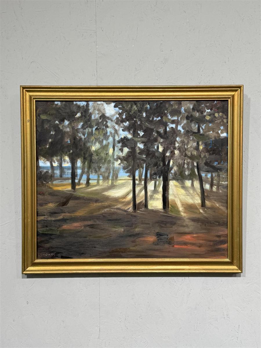 Öljyvärimaalaus, jossa kuvataan metsämaisema. Teos on signeerattu ’Aino -91’, eli Aino Pihlajavaara. Kultainen kehys ympäröi maalausta, tuoden esiin sen yksityiskohdat ja sävyt.