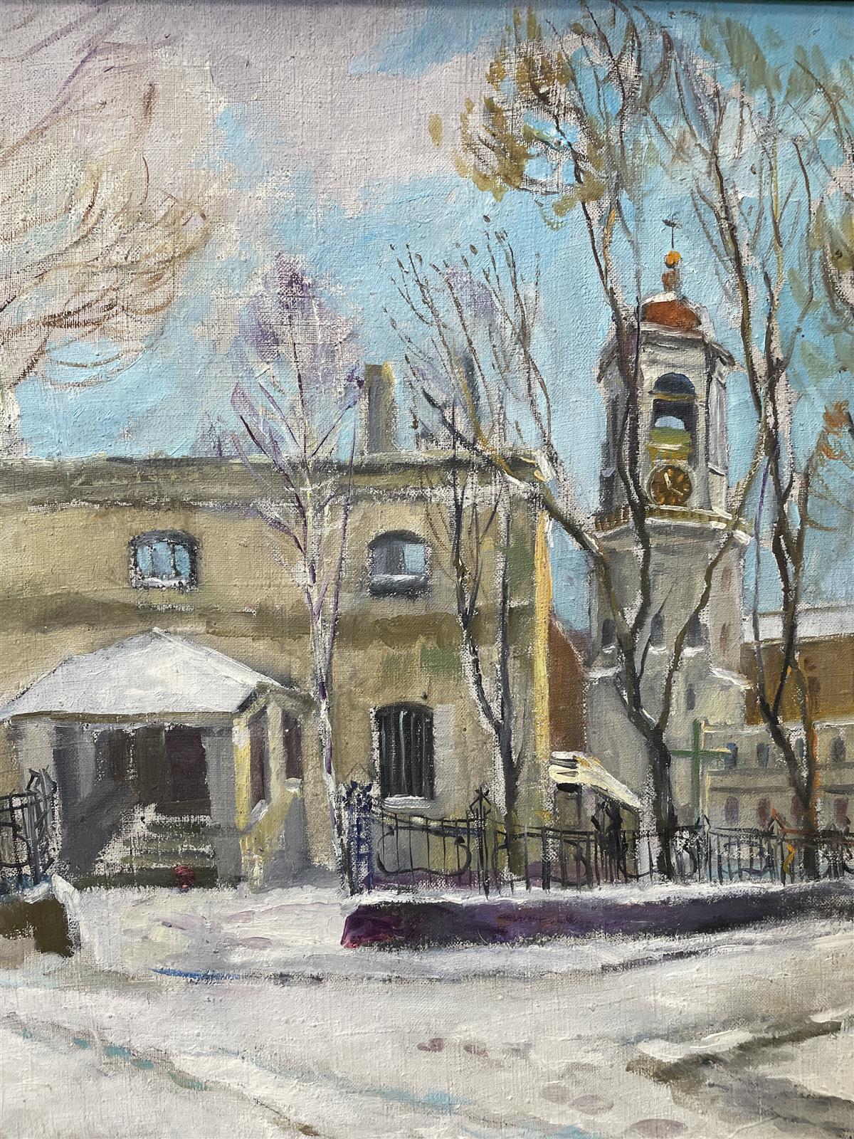 Teos esittää talvista maisemaa, jossa on rakennuksia ja puita. Kehystetty koristeellisella kehyksellä.