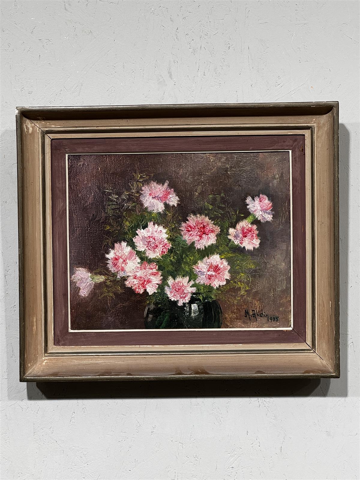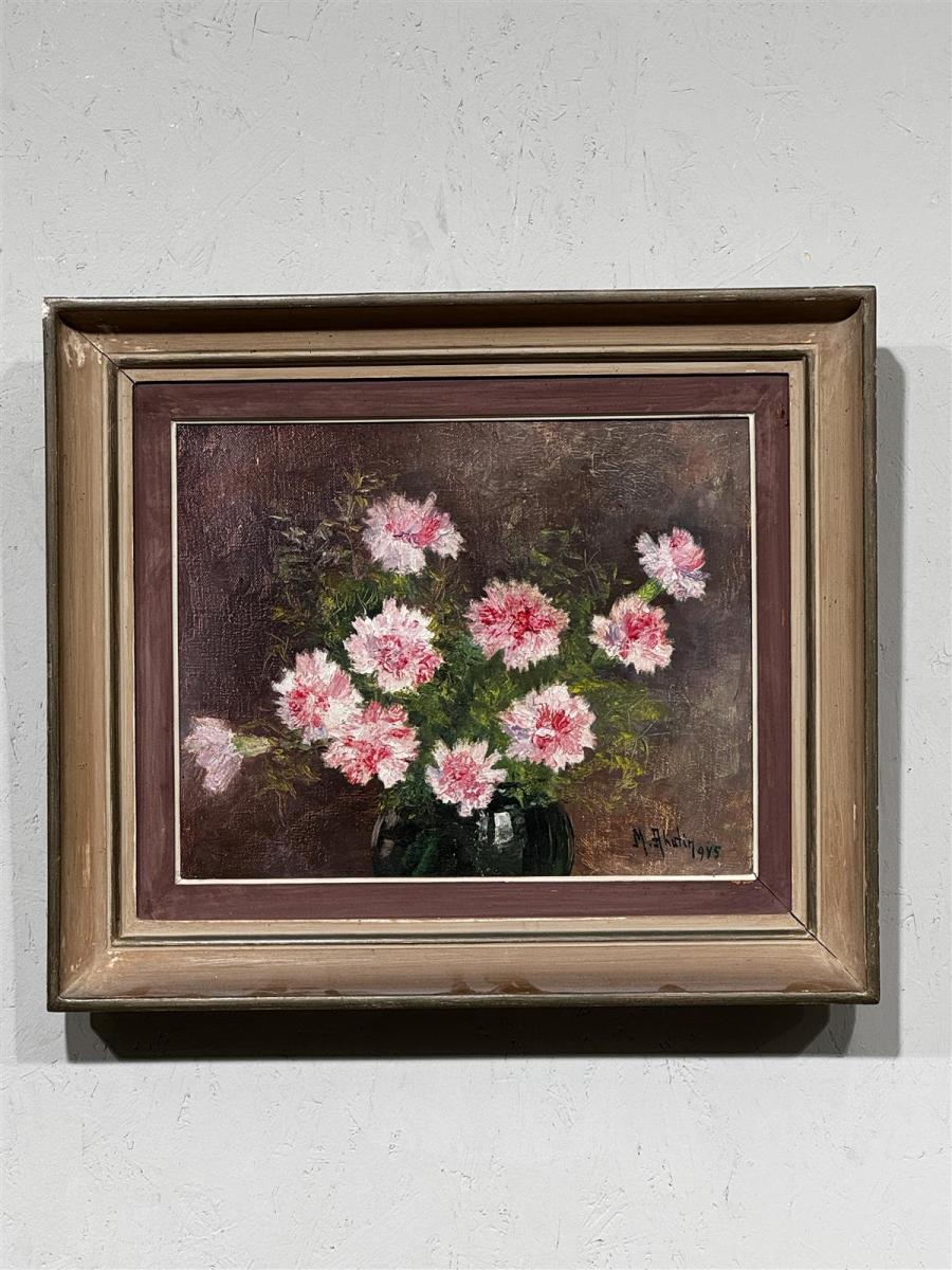 Öljyvärimaalaus, jossa on kukka-asetelma. Maalaus on signeerattu M. Akutin 1945.